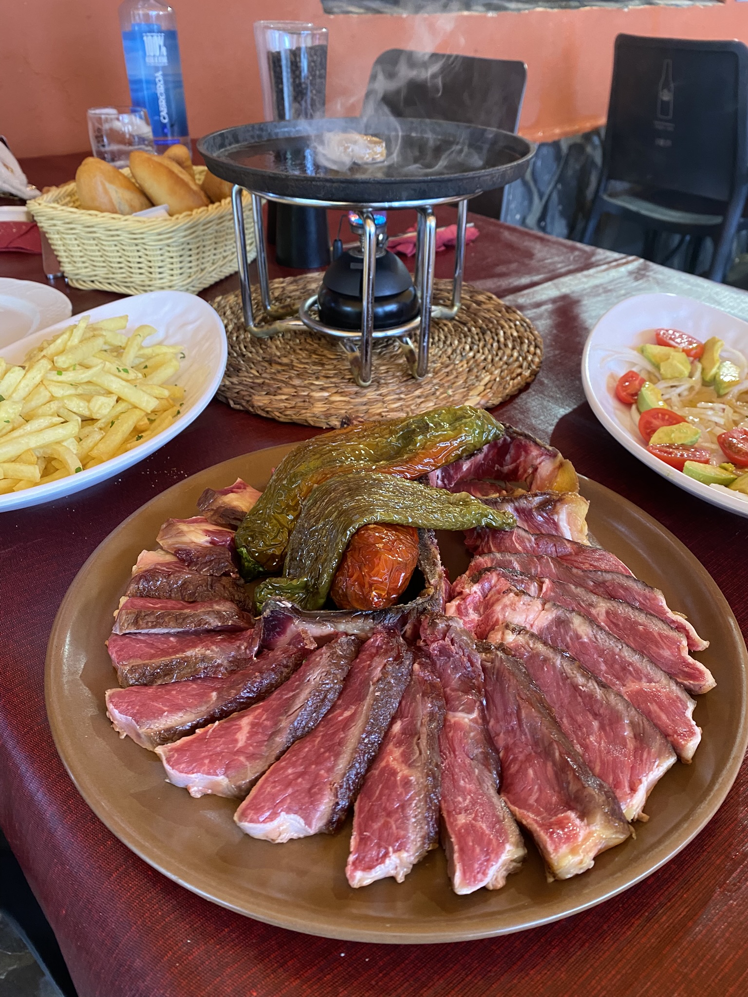 chuletón de vaca con verduras para hacer sobre la marcha, ración de papas fritas y ensalada de tomates & aguacate