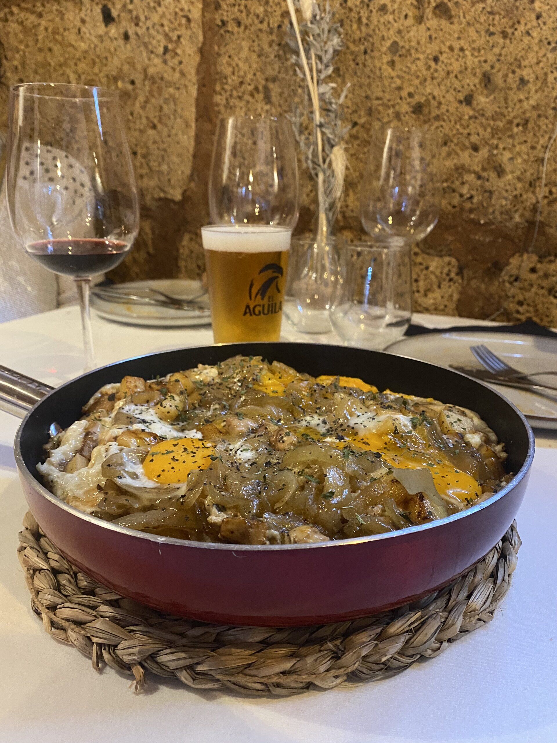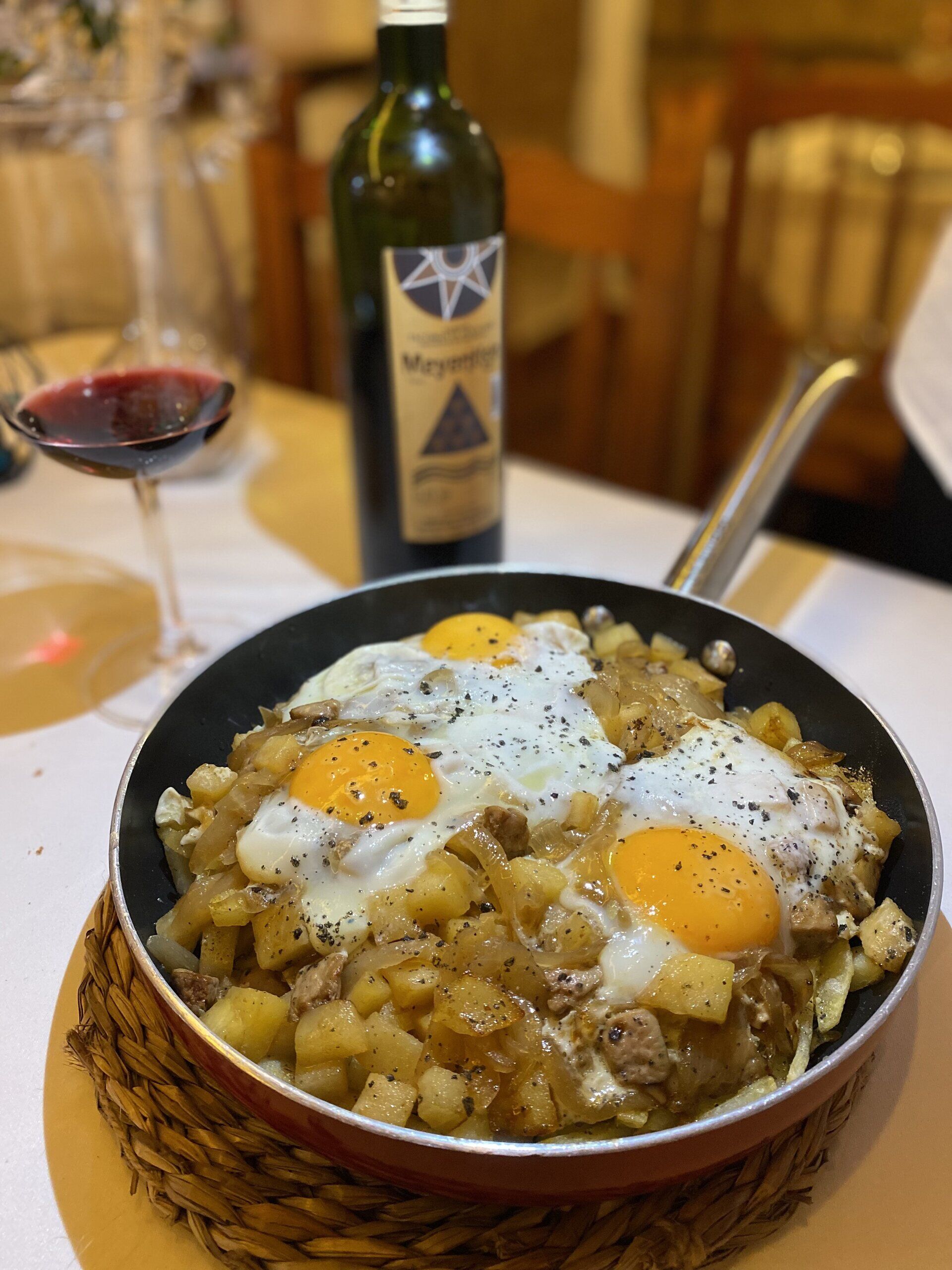 sartén de huevos rotos con foie, manzana, papas y cebolla caramelizada