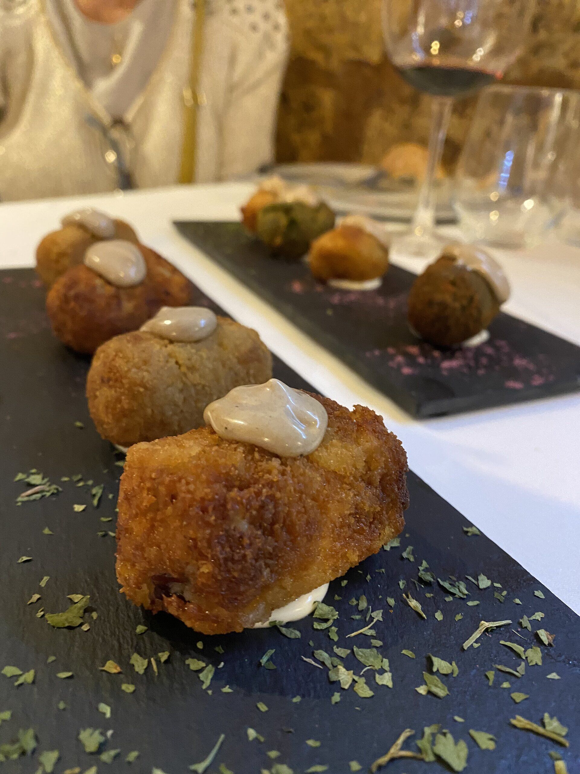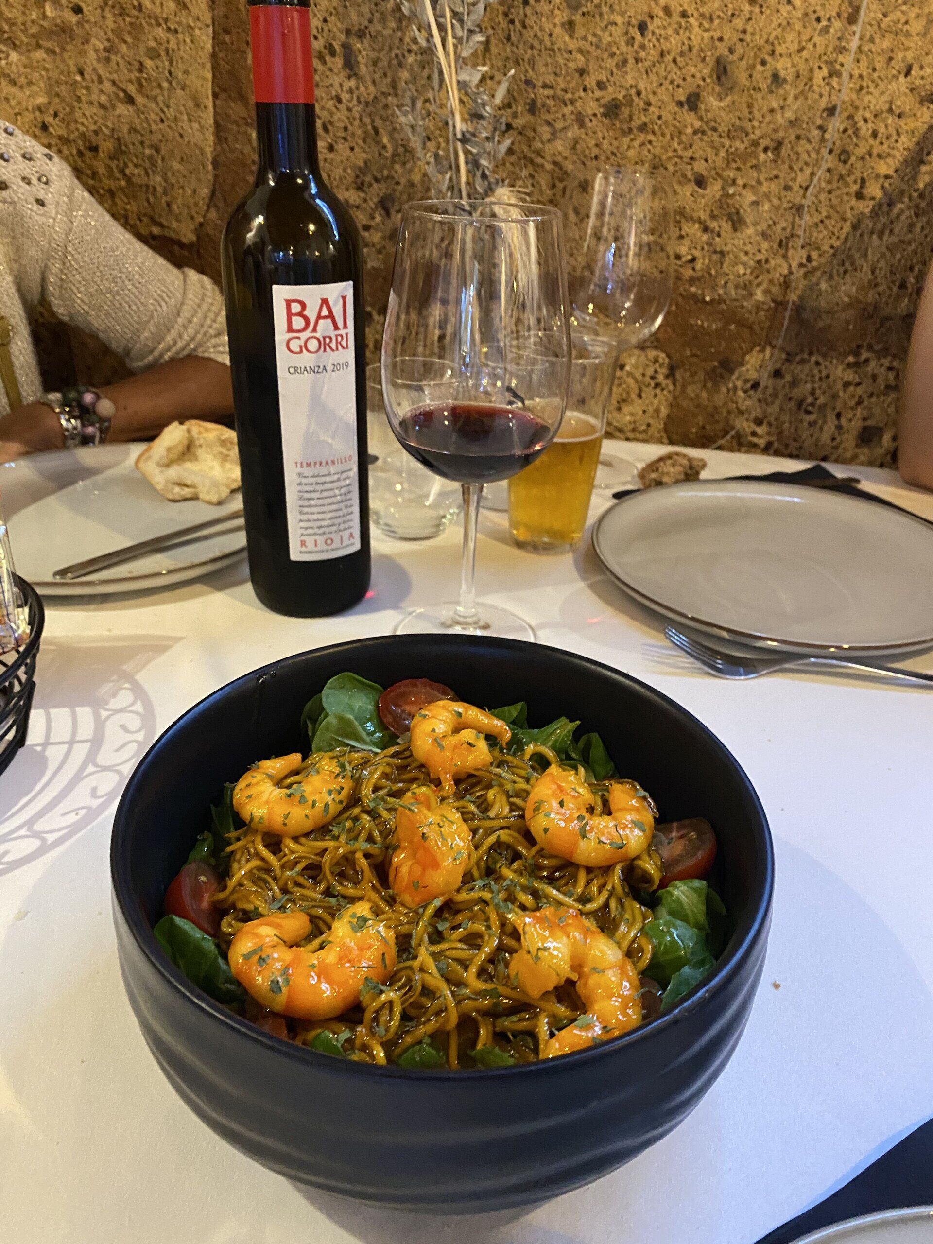 ensalada tequila con gulas y gambas con reducción de tequila, mango y maracuyá