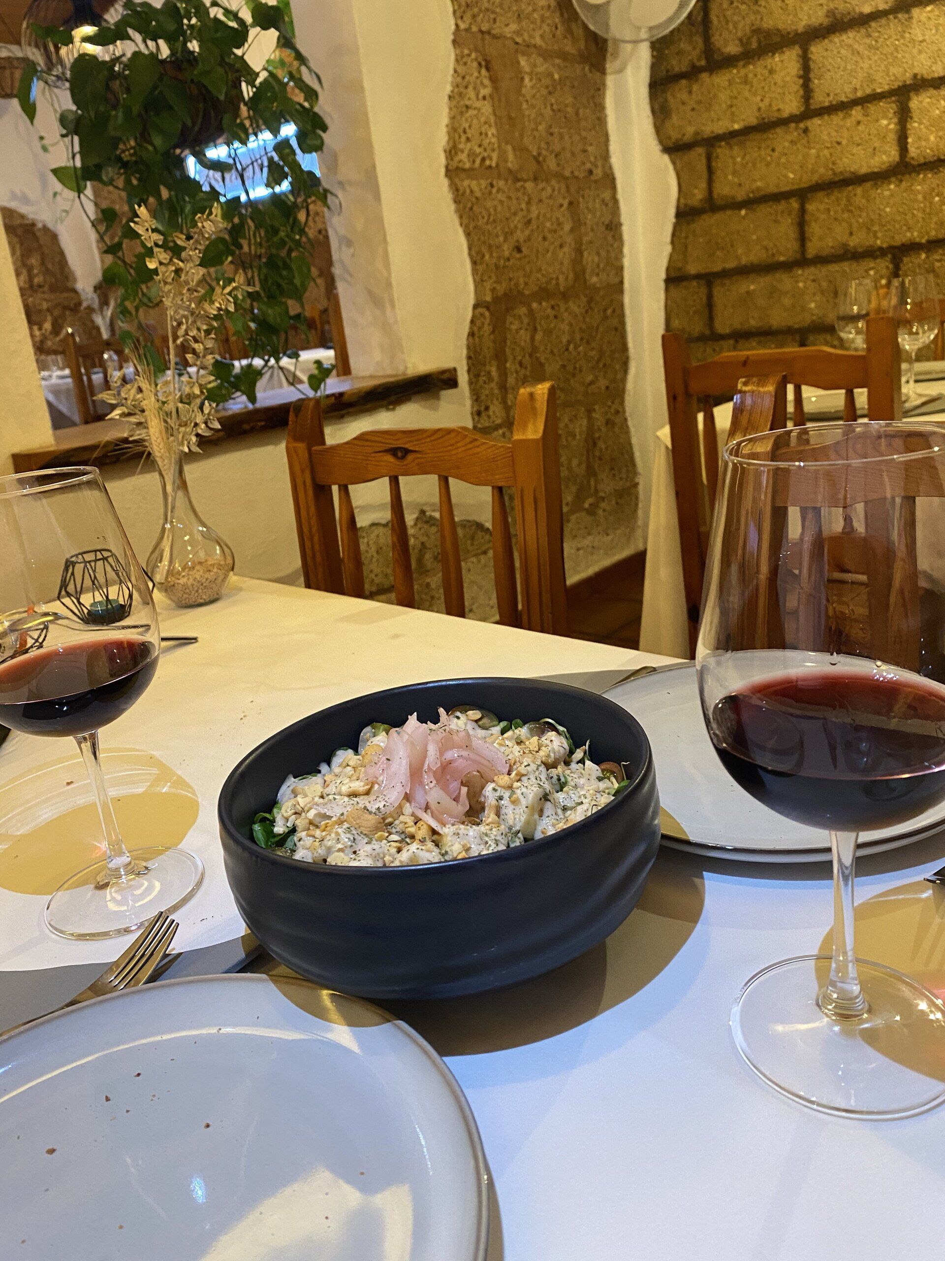 ensalada defruta y yogur ahumado: canónigos, rúcula, cherry kumato, manzana, pera, salsa de yogur ahumado y canela, anacardos fritos y cebolla de guayonge encurtida