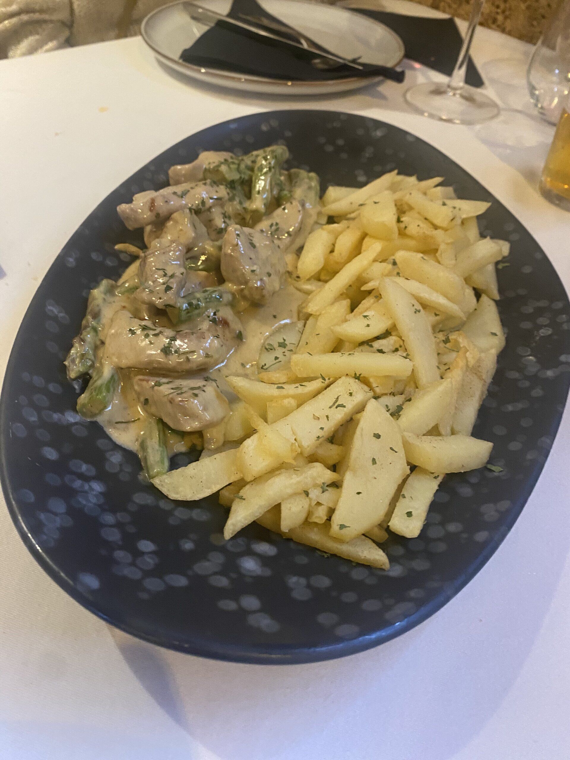 solomillo con salsa de gorgonzola y espárragos trigueros