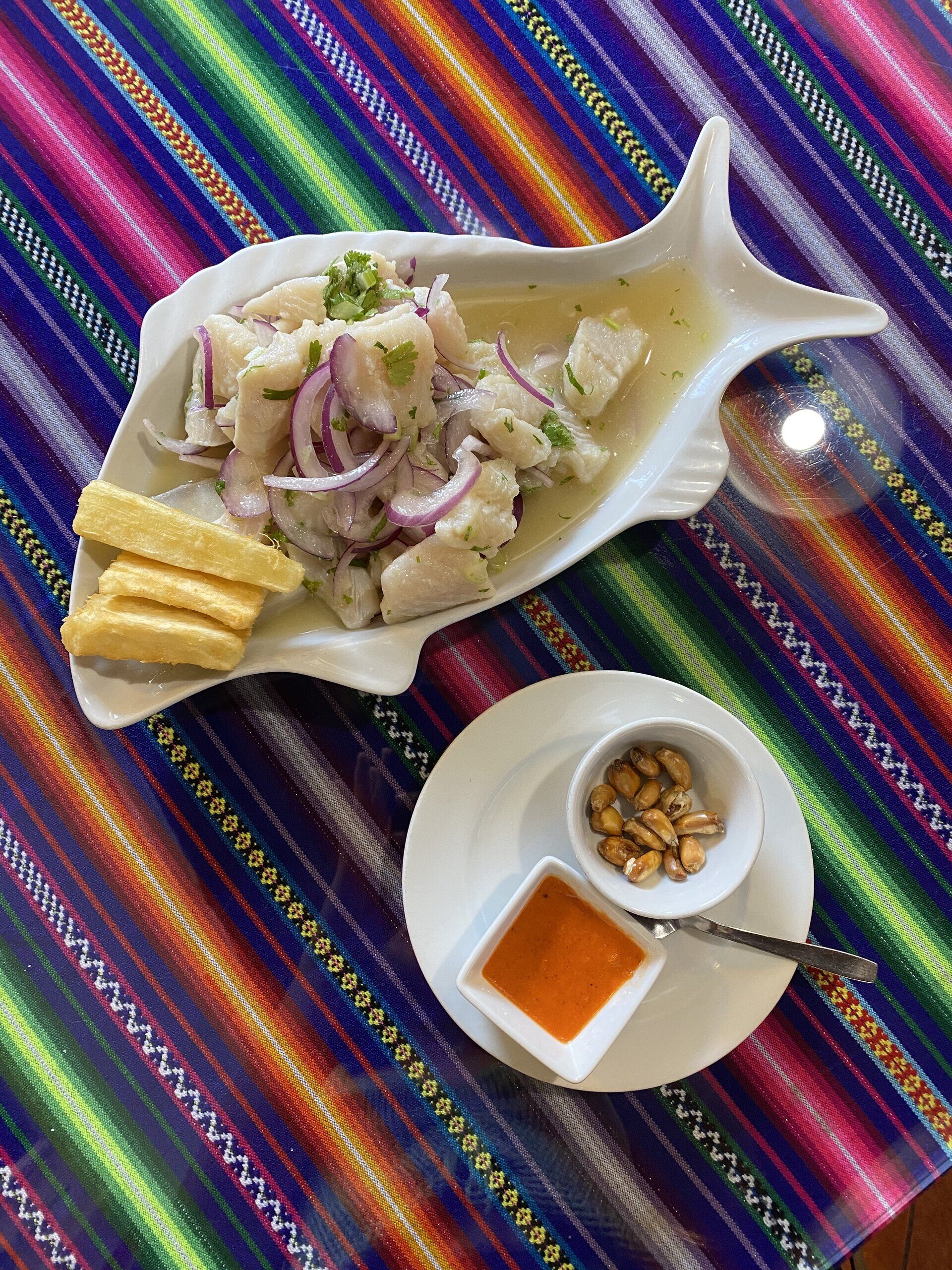 ceviche clásico de pescado macerado en limón con cebolla, batata y yuca