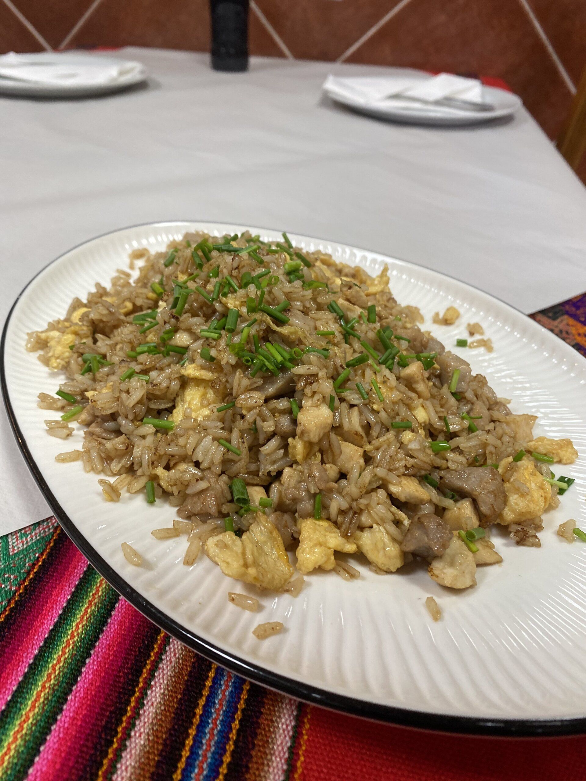 arroz chaufa de pollo, cerdo, tortilla de huevo, pimiento rojo, jengibre, salsa de soja, cilantro y cebollino