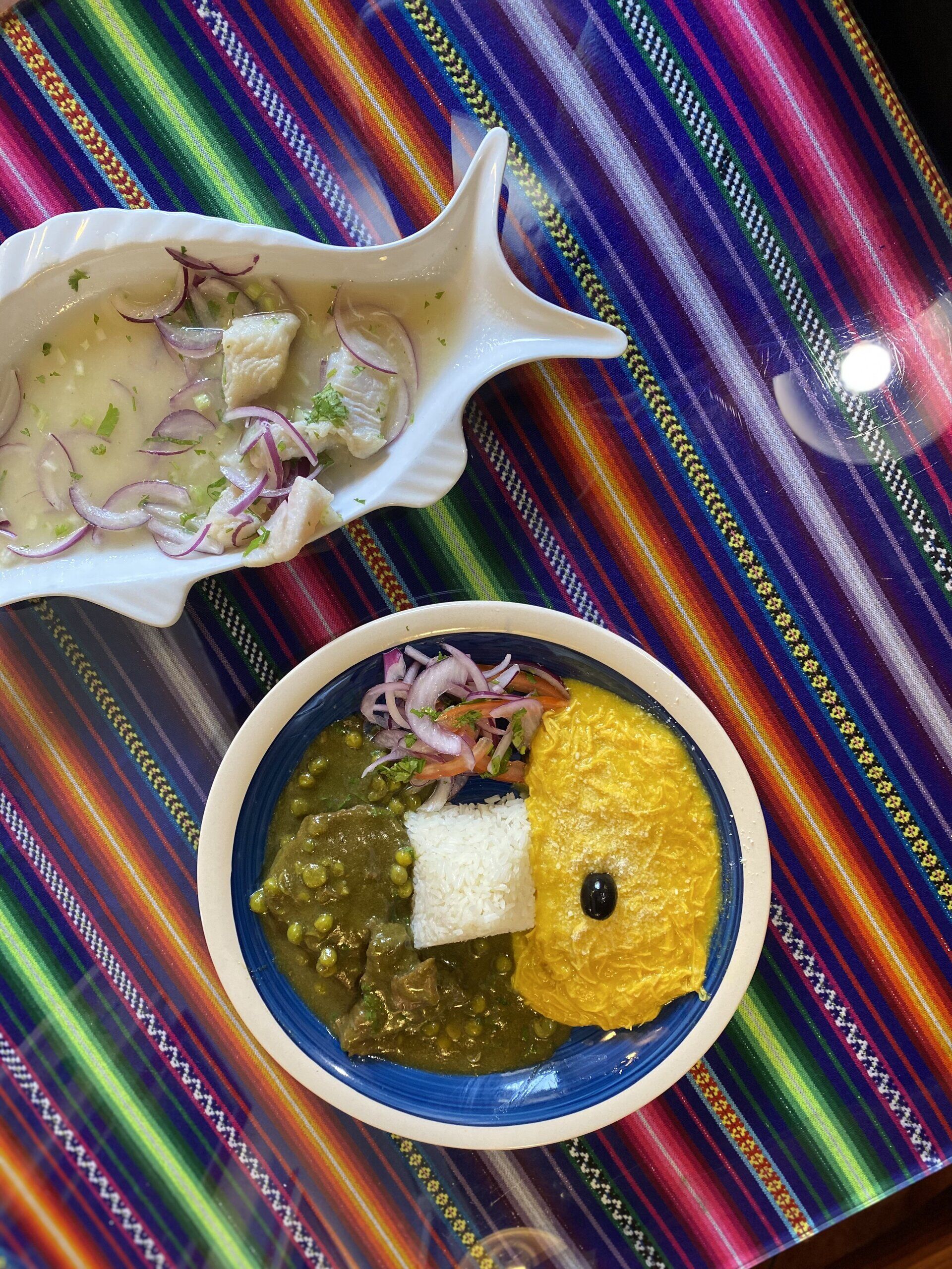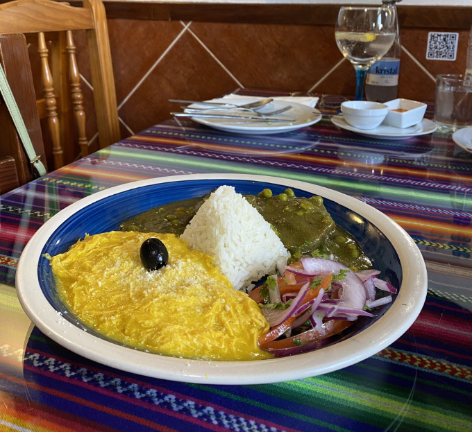 combinado criollo: ají de gallina y seco de res, acompañado de arroz blanco y ensalada criolla