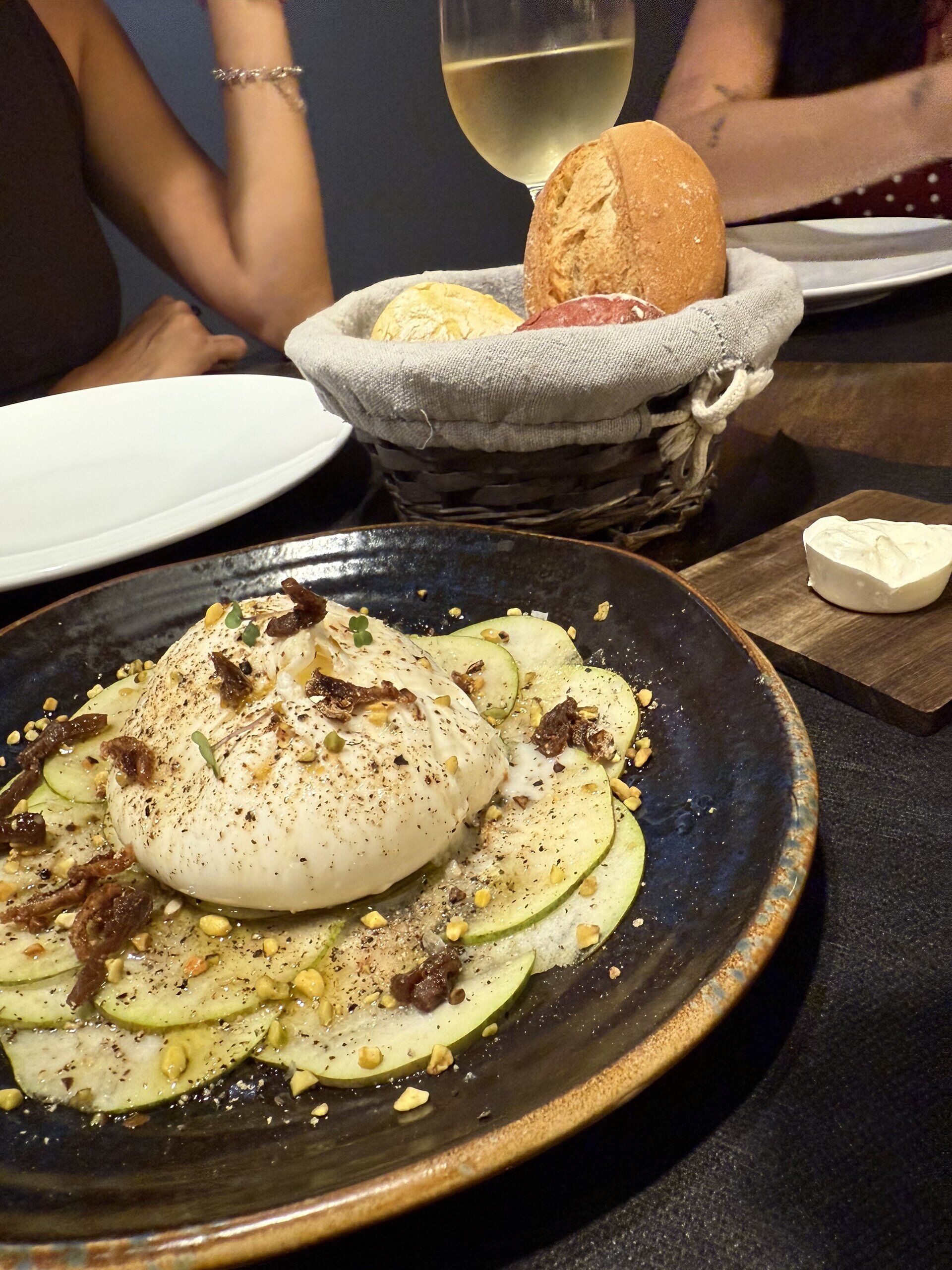 burrata con carpaccio de pera y pistacho