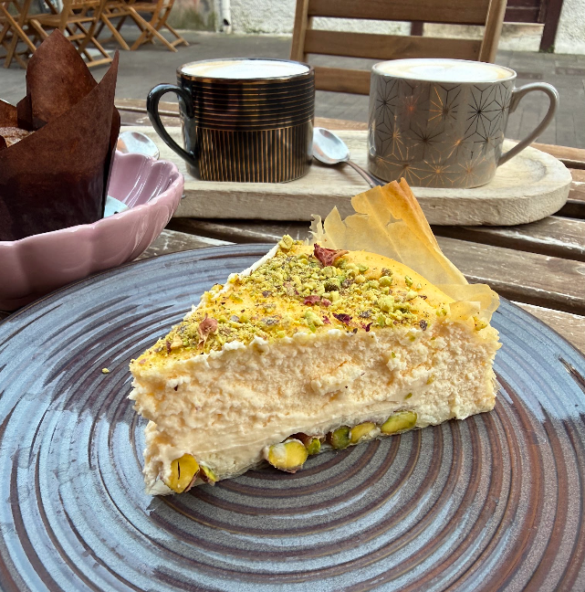 tarta de queso sobre una base de masa de filo y muchos pistachos