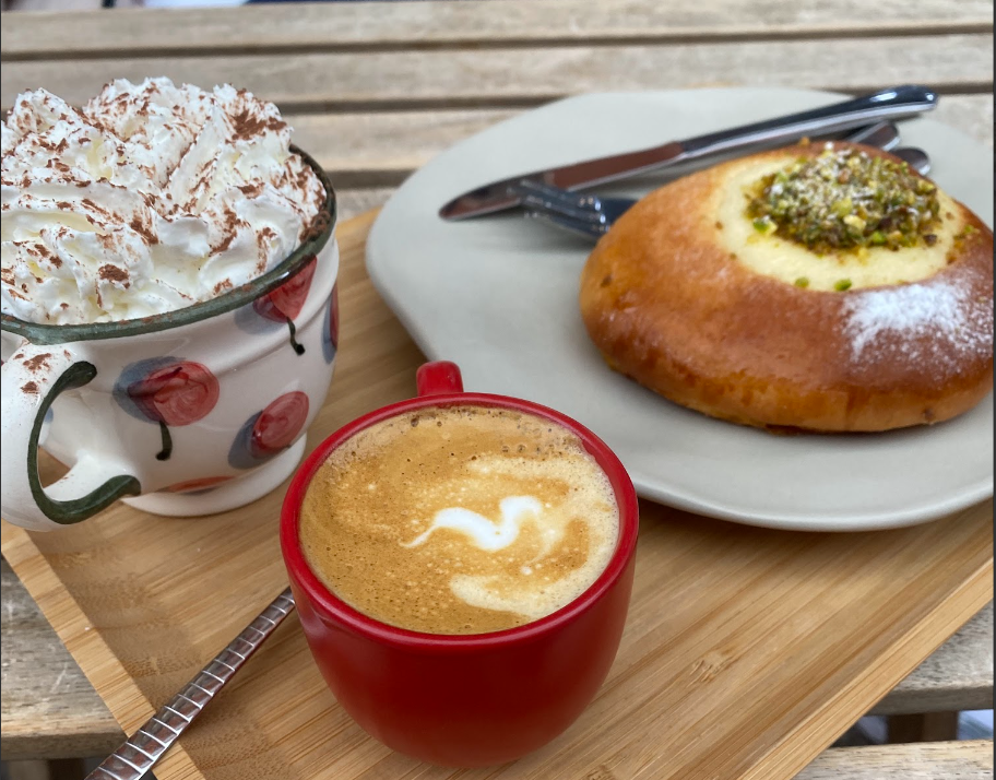 café con leche, chocolate con nata y pan dulce con crema y pistacho