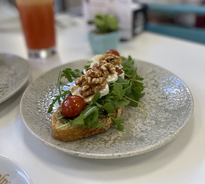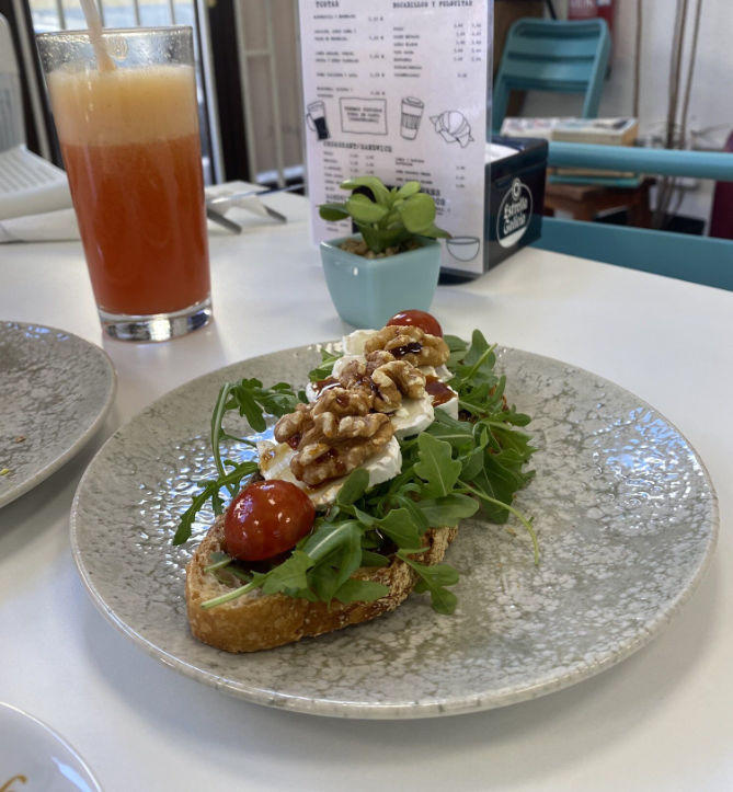 tosta de rúcula, queso de rulo y tomate cherry y nueces con miel