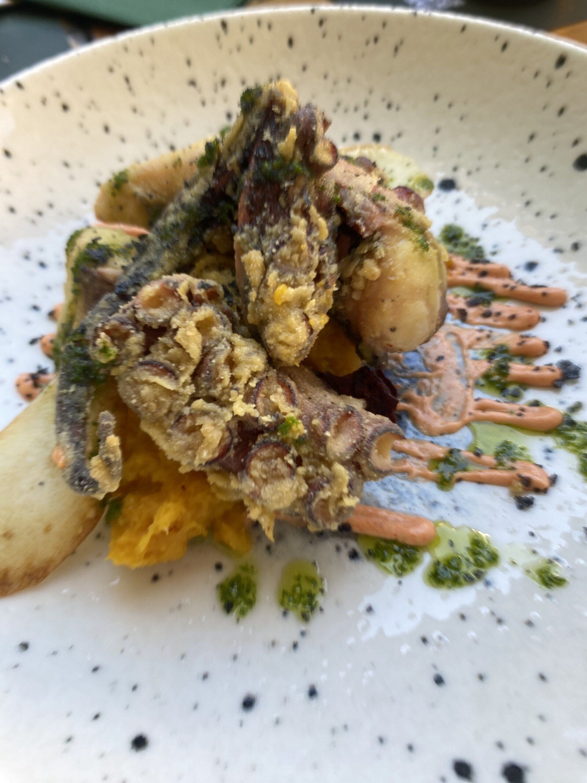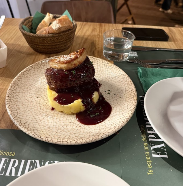 solomillo con foie y salsa de oporto acompañado de un puré de papas