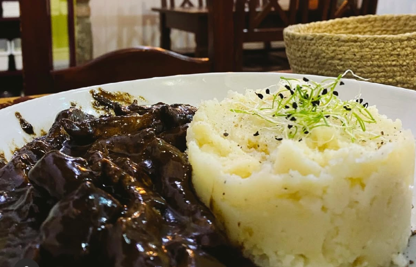 puntas de solomillo ibérico con salsa de ajo negro y mascarpone