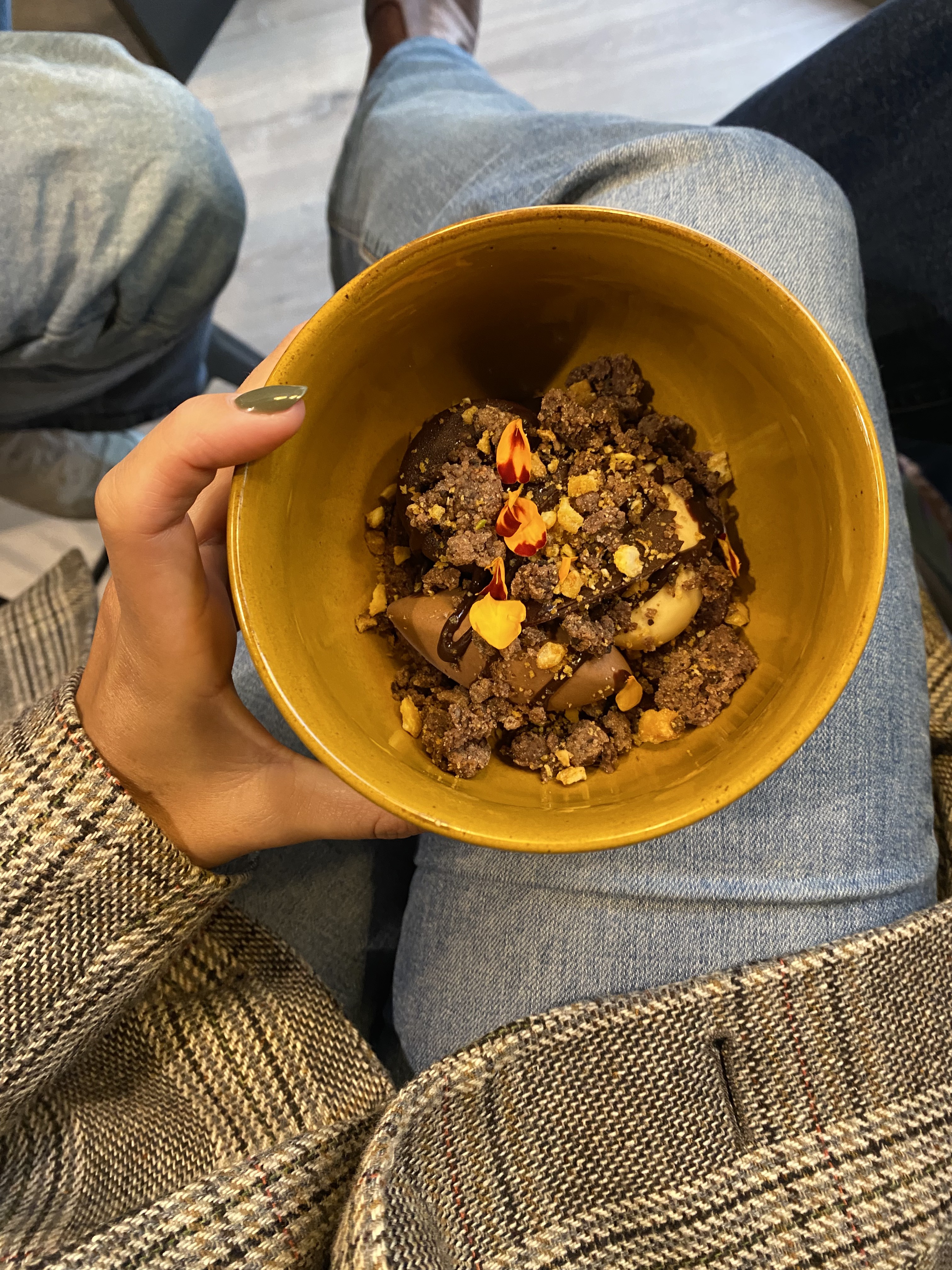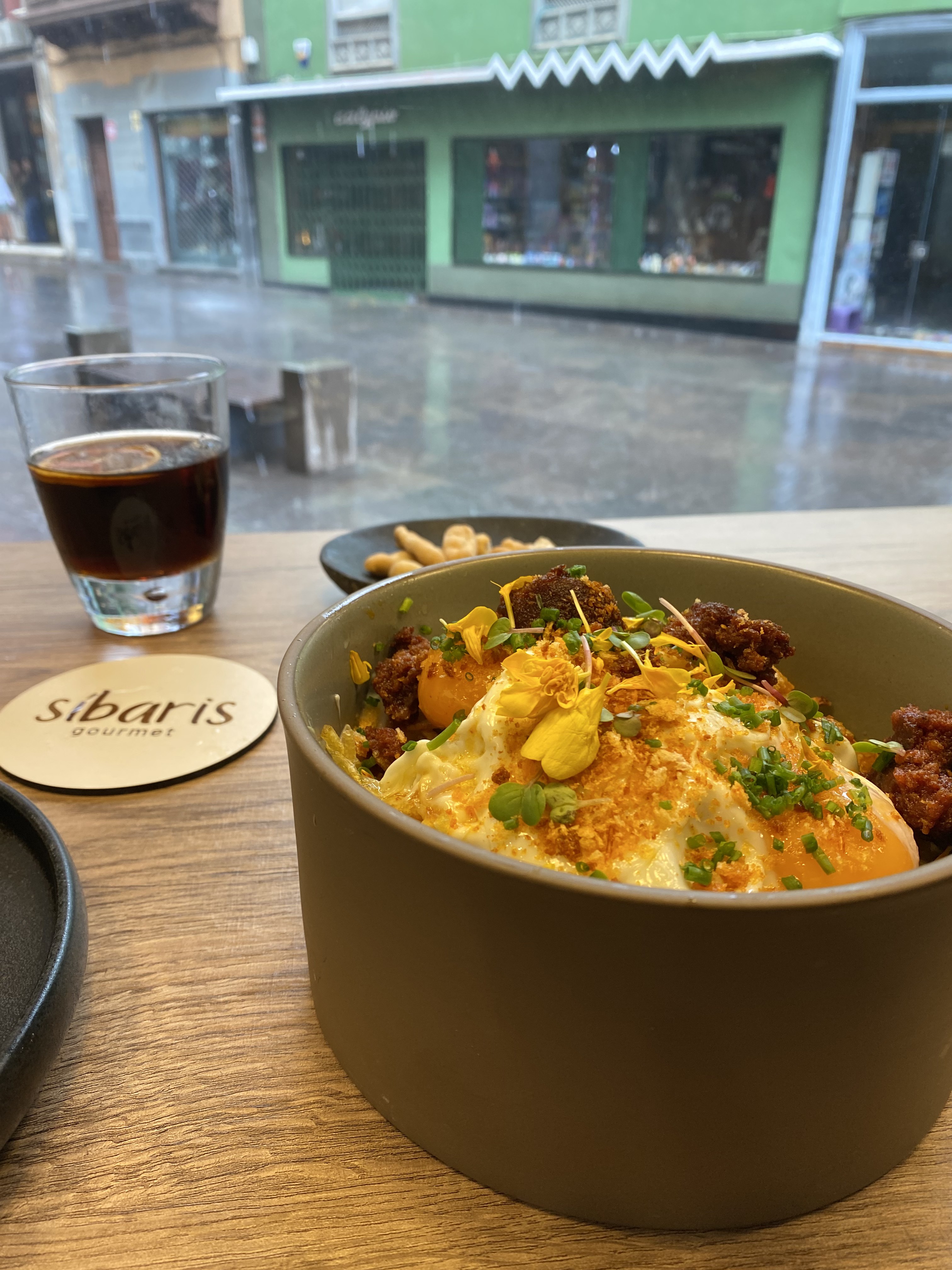 huevos rotos con papas paja, sobrasada de trufa y parmentiere