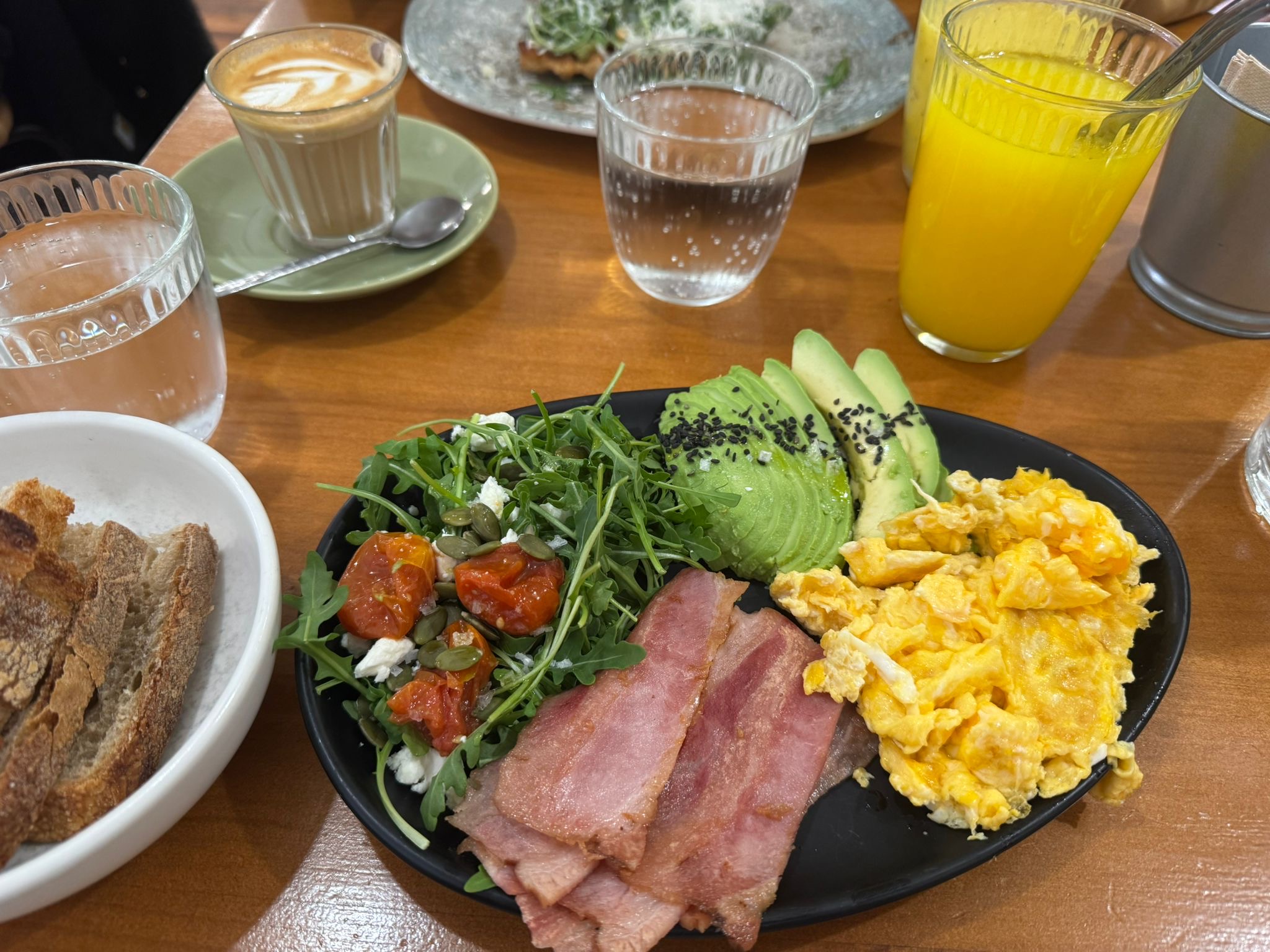 eggs lover: huevos revueltos con aguacate, ensalada y bacon ahumado