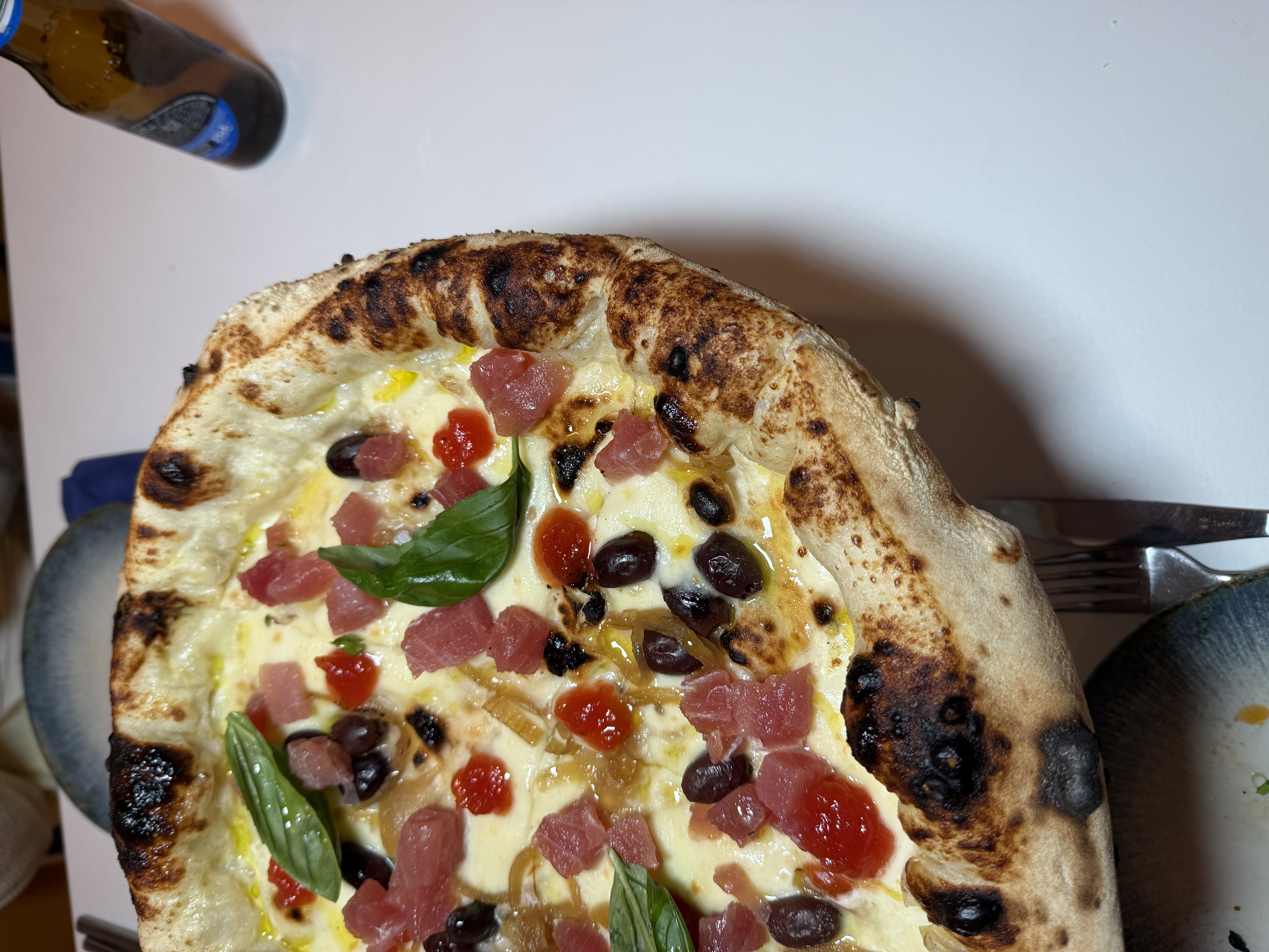 pizza contemporánea (especialidad): atún crudo, mozzarella fior de latte, cebolla caramelizada, crumble de aceitunas taggiasca, mermelada de tomate y AOVE