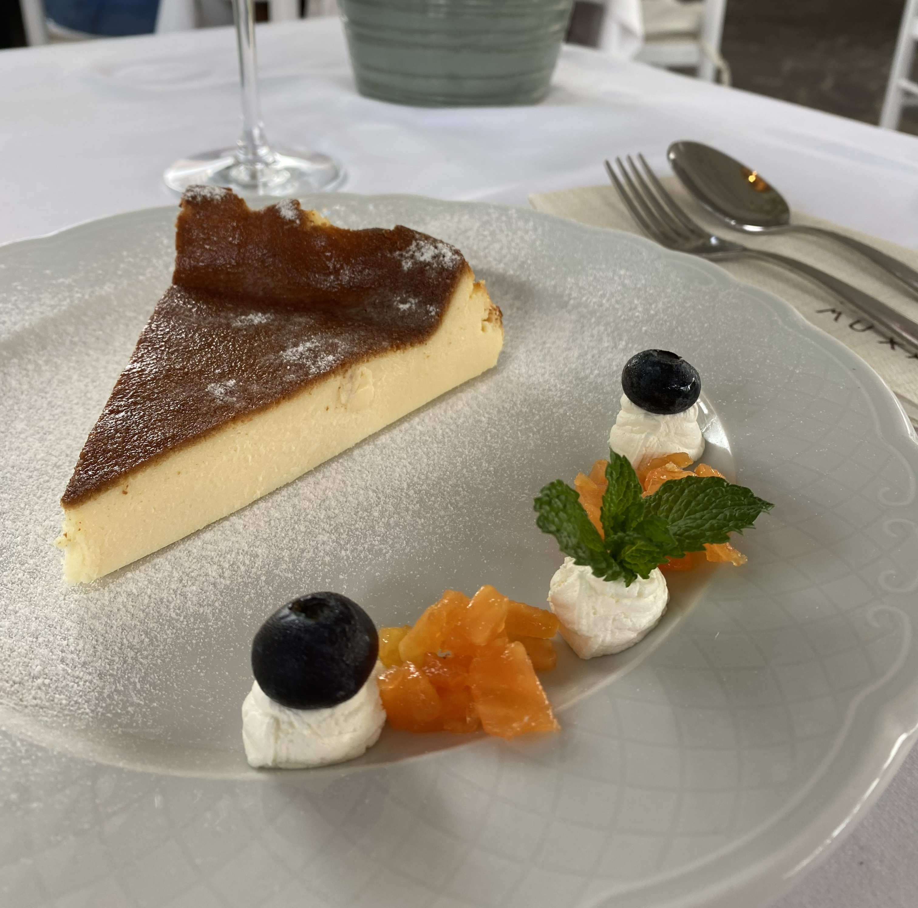 tarta de queso con frutas: papaya y arándanos