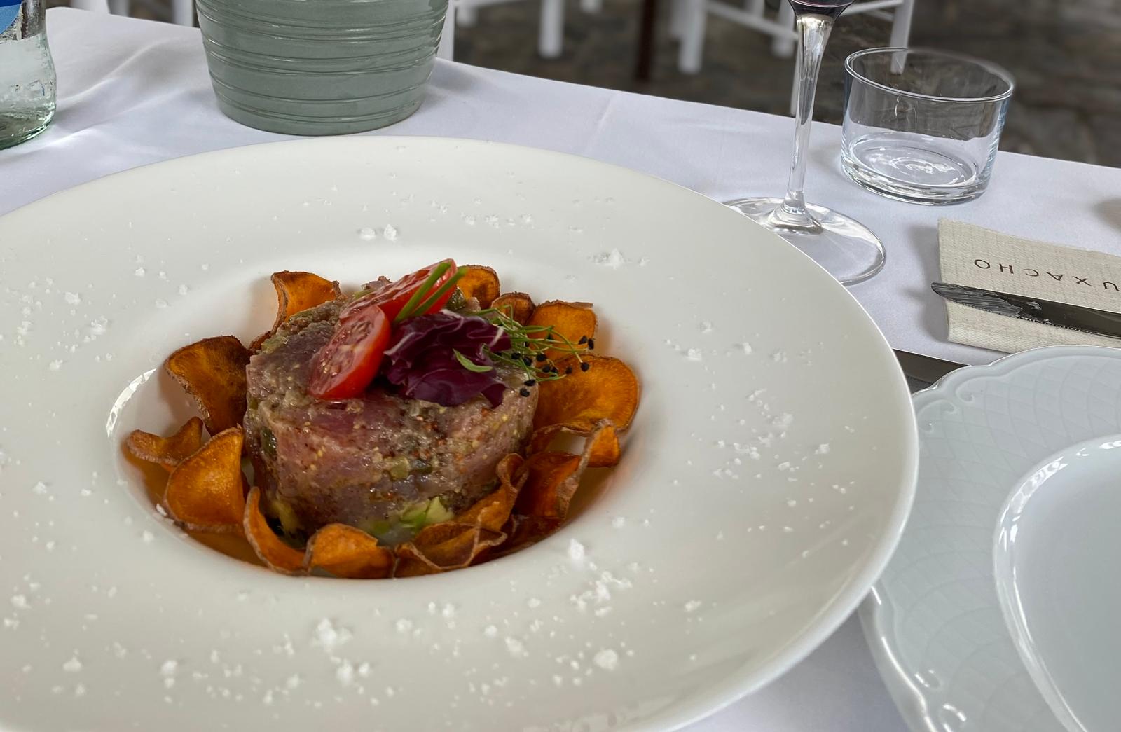 tartar de atún rojo sobre aguacate y chips de batata