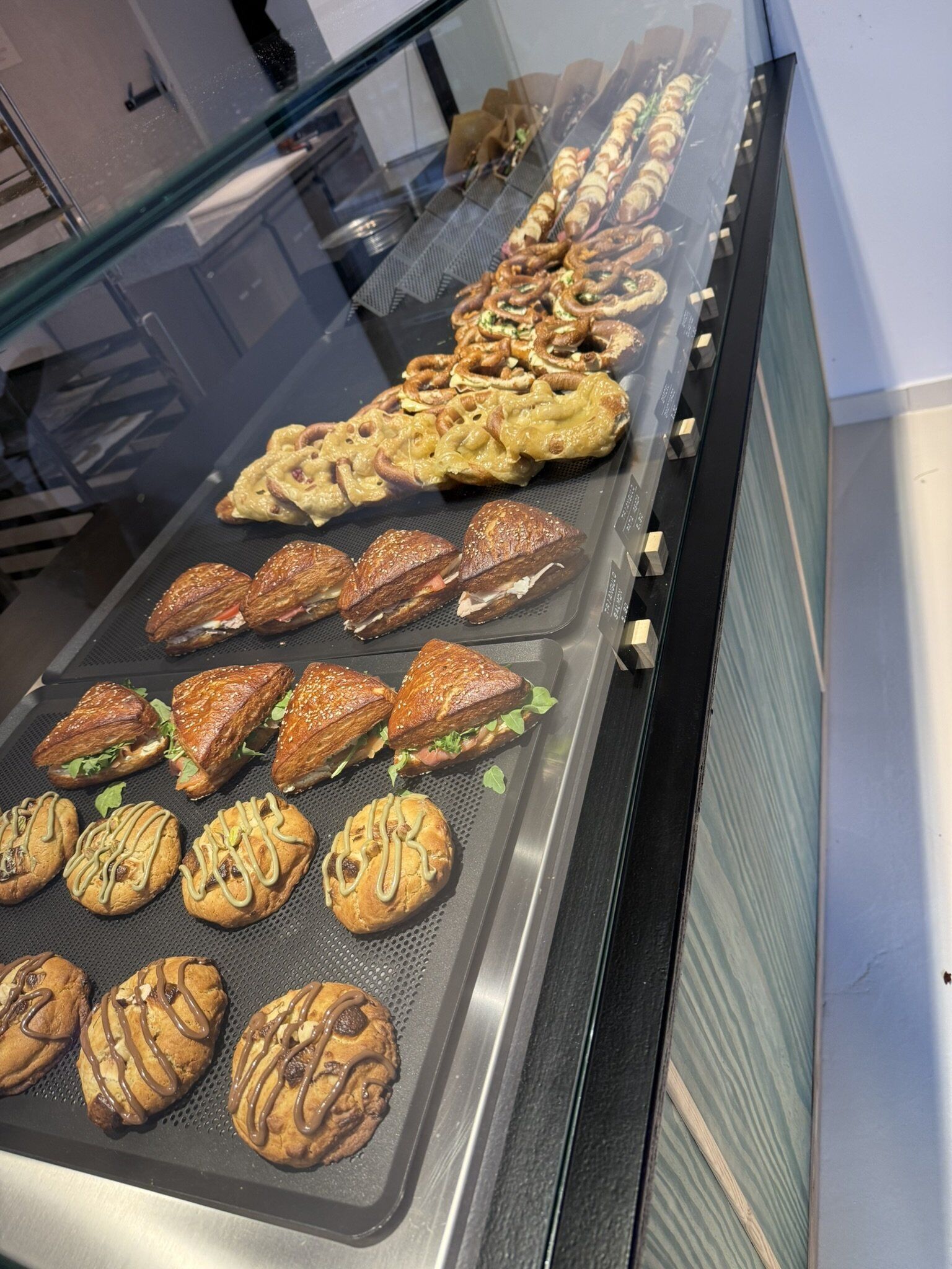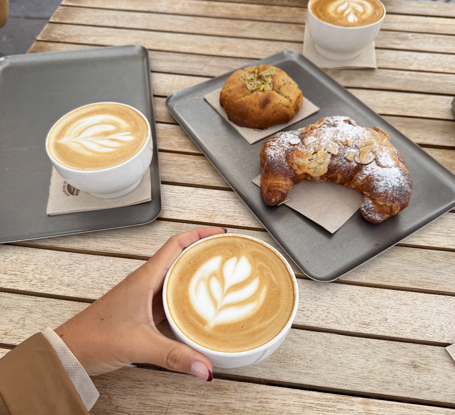 cafecito rico flat white con croissant de almendra y cookies de pistacho
