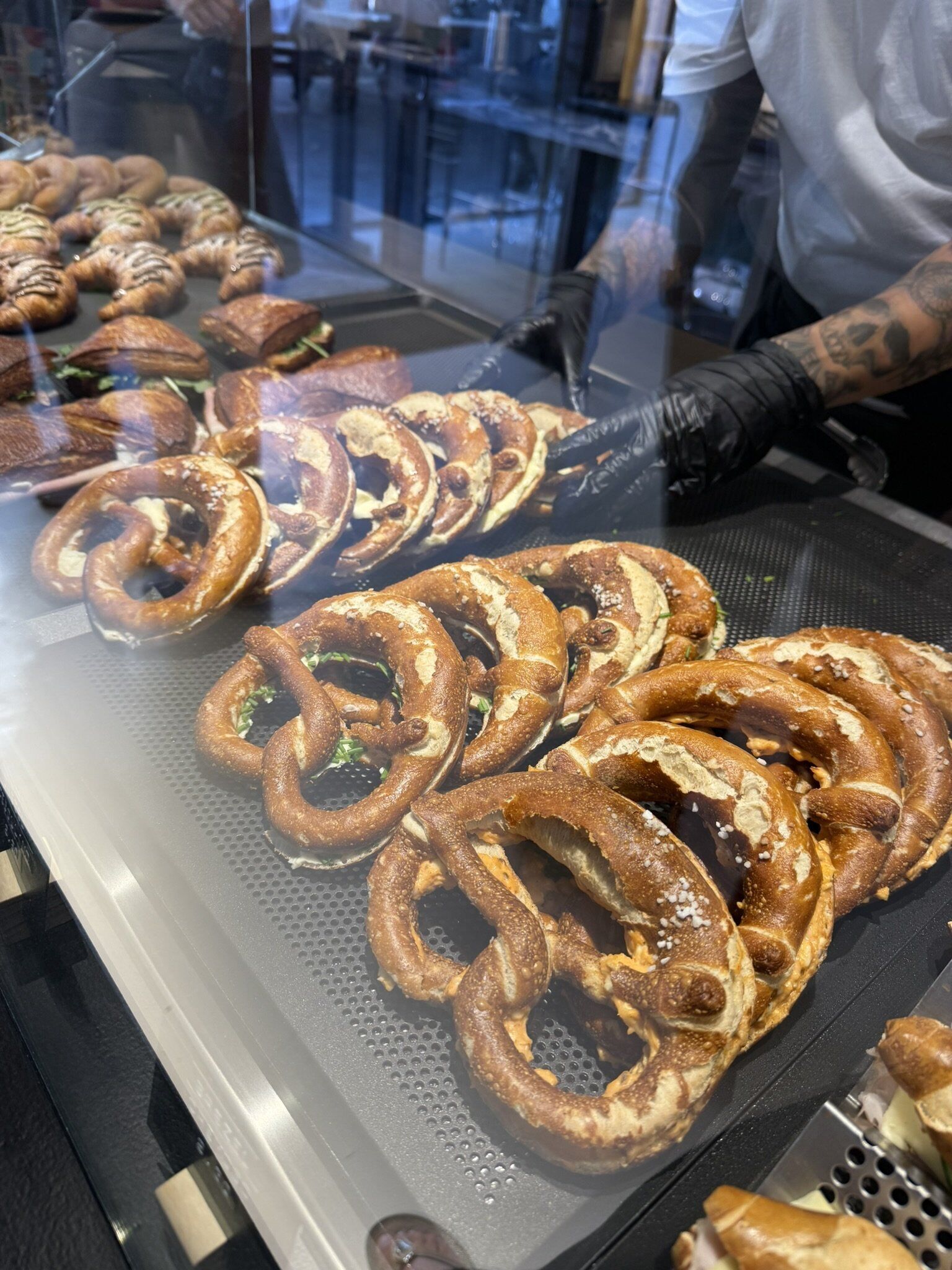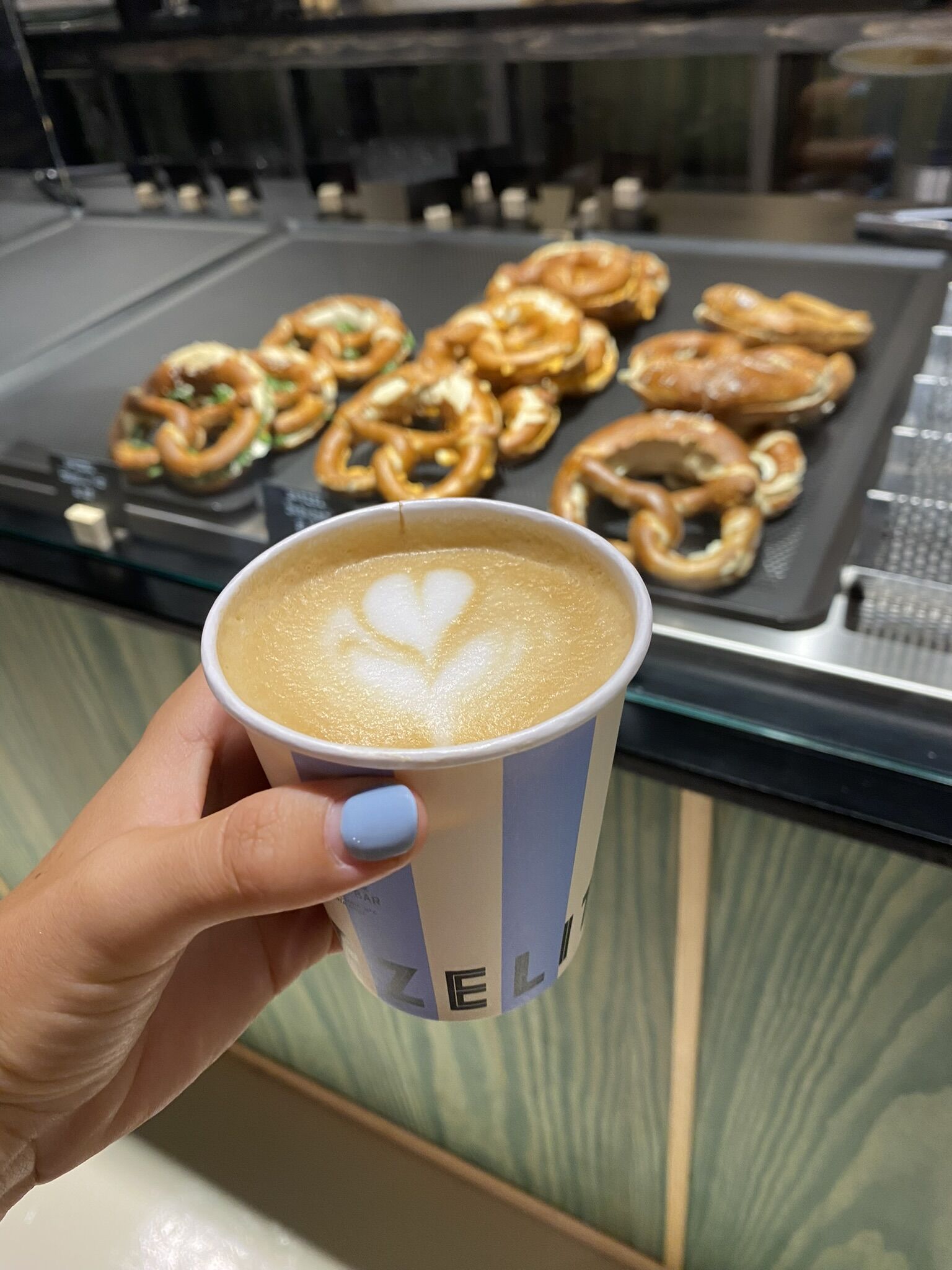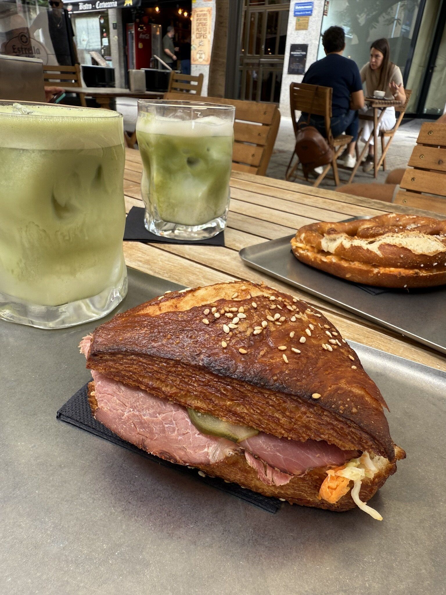 matcha cloud (con leche de coco) y matcha latte caliente, bretzel clásico relleno de mantequilla y sandwich de pastrami