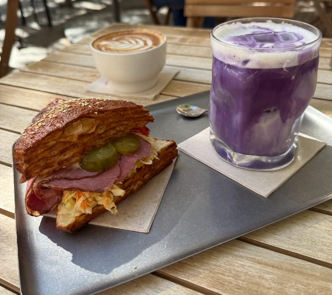 sandwich de brezel con pastrami y un ube latte