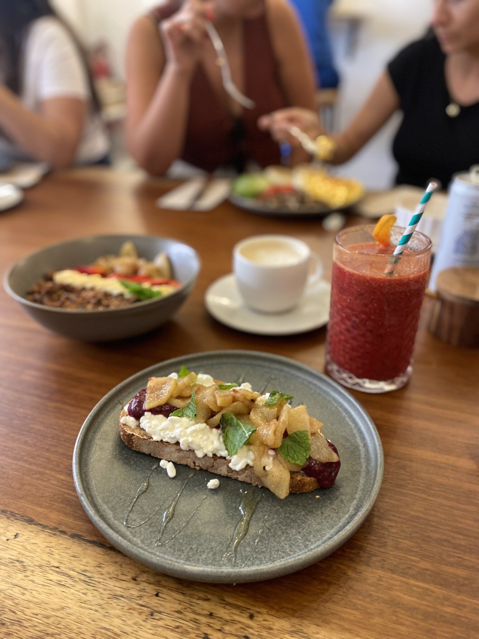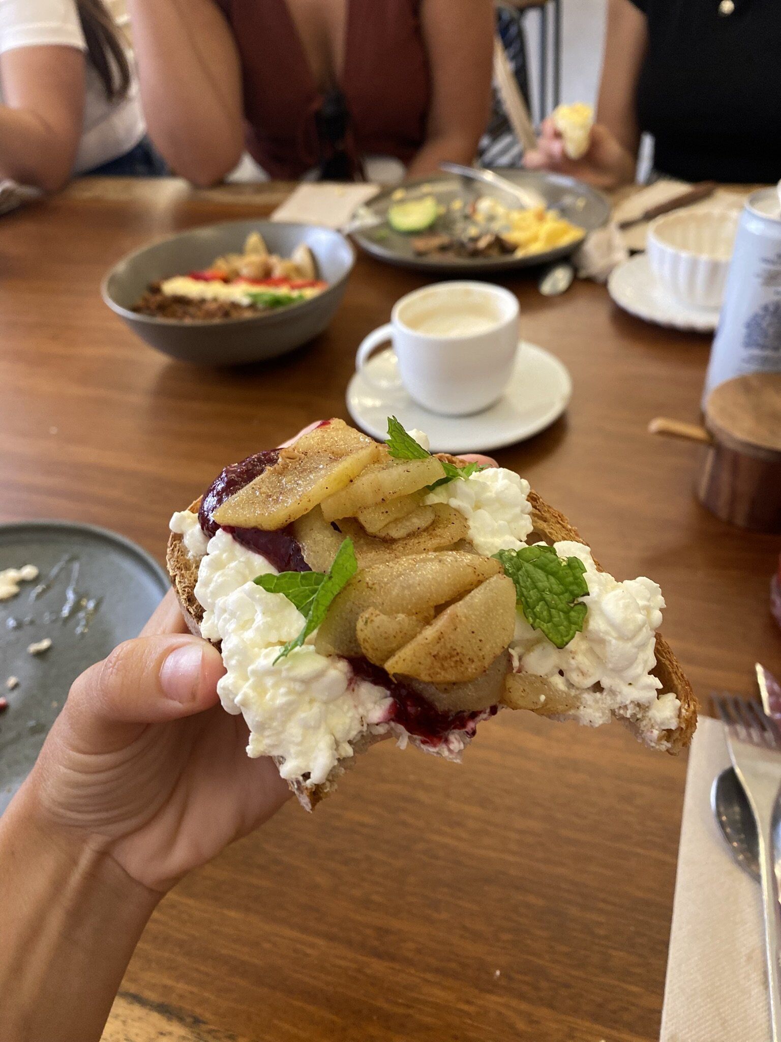 tosta de queso cottage con mermelada y pera asada con un toque de menta