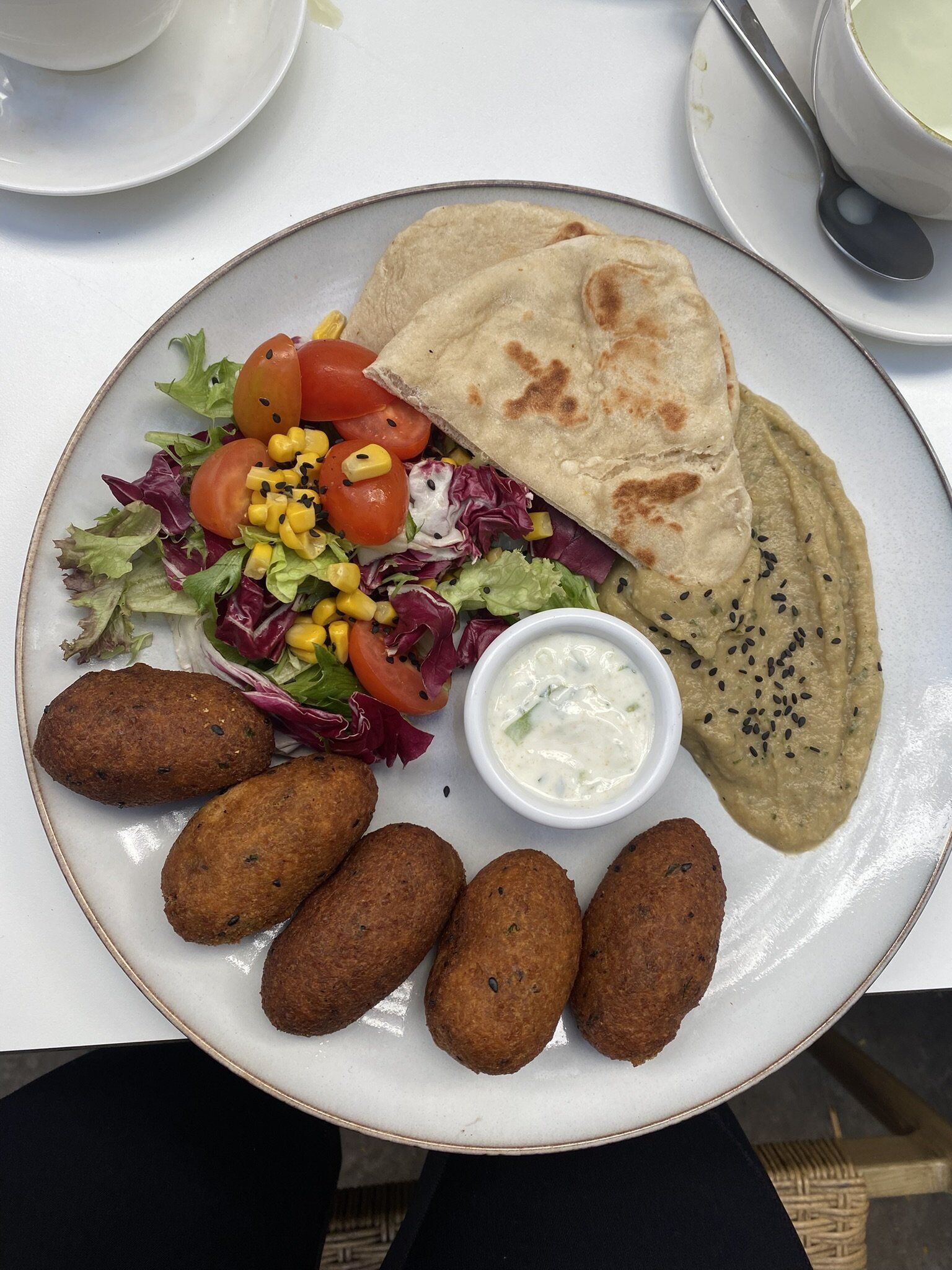 antiguo filfil: falafel, babaganush con pan de pita casero y ensalada