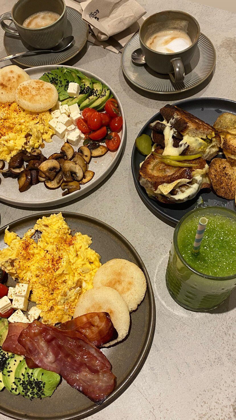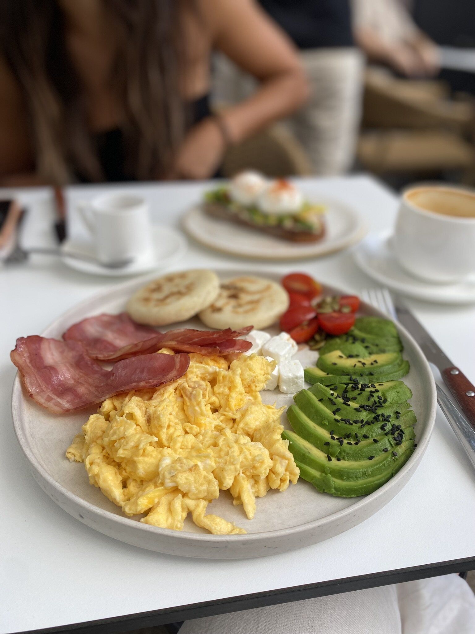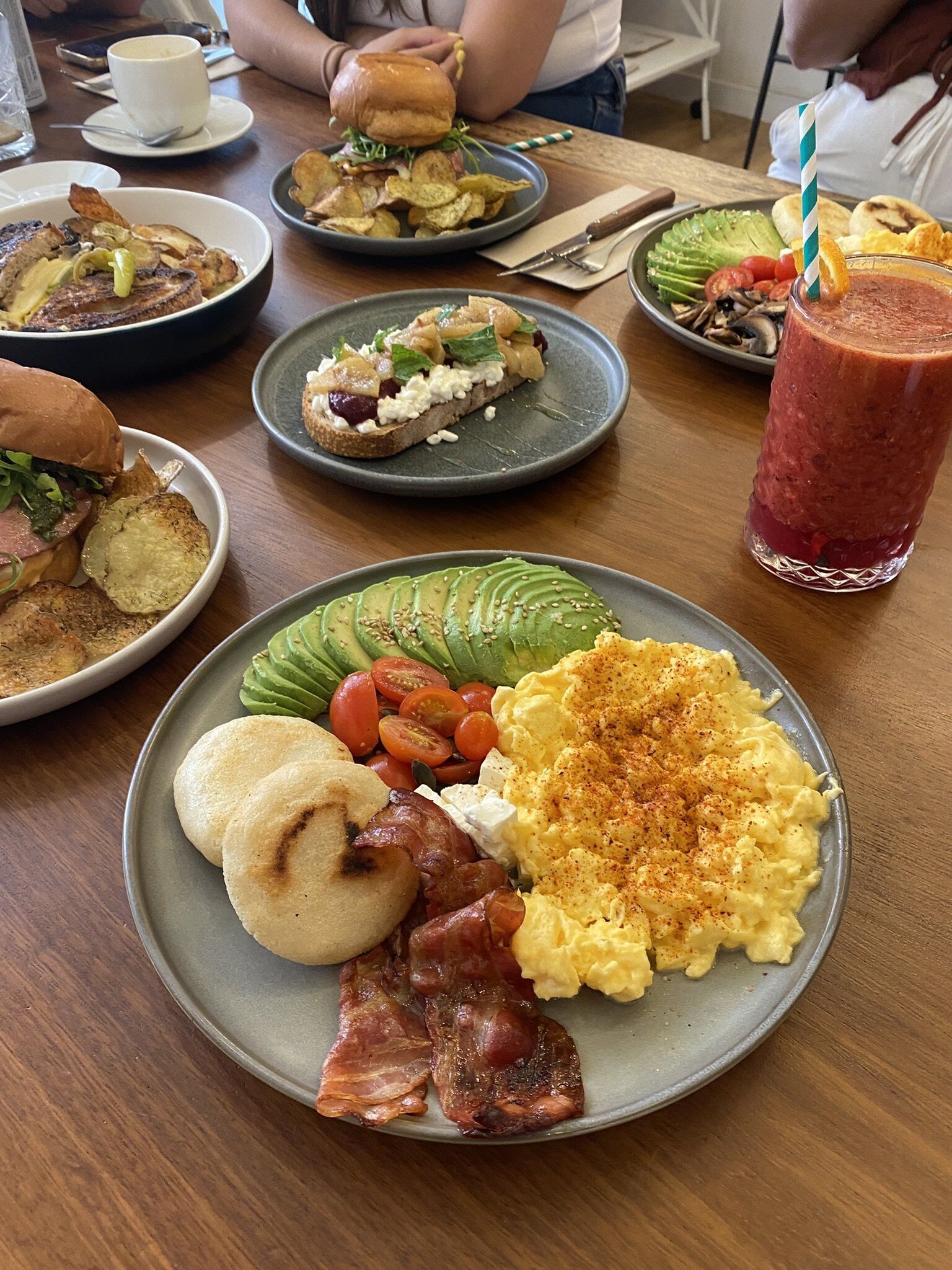 funkys: (un clásico)_ huevos, bacon, aguacate, tomates, queso feta y arepitas