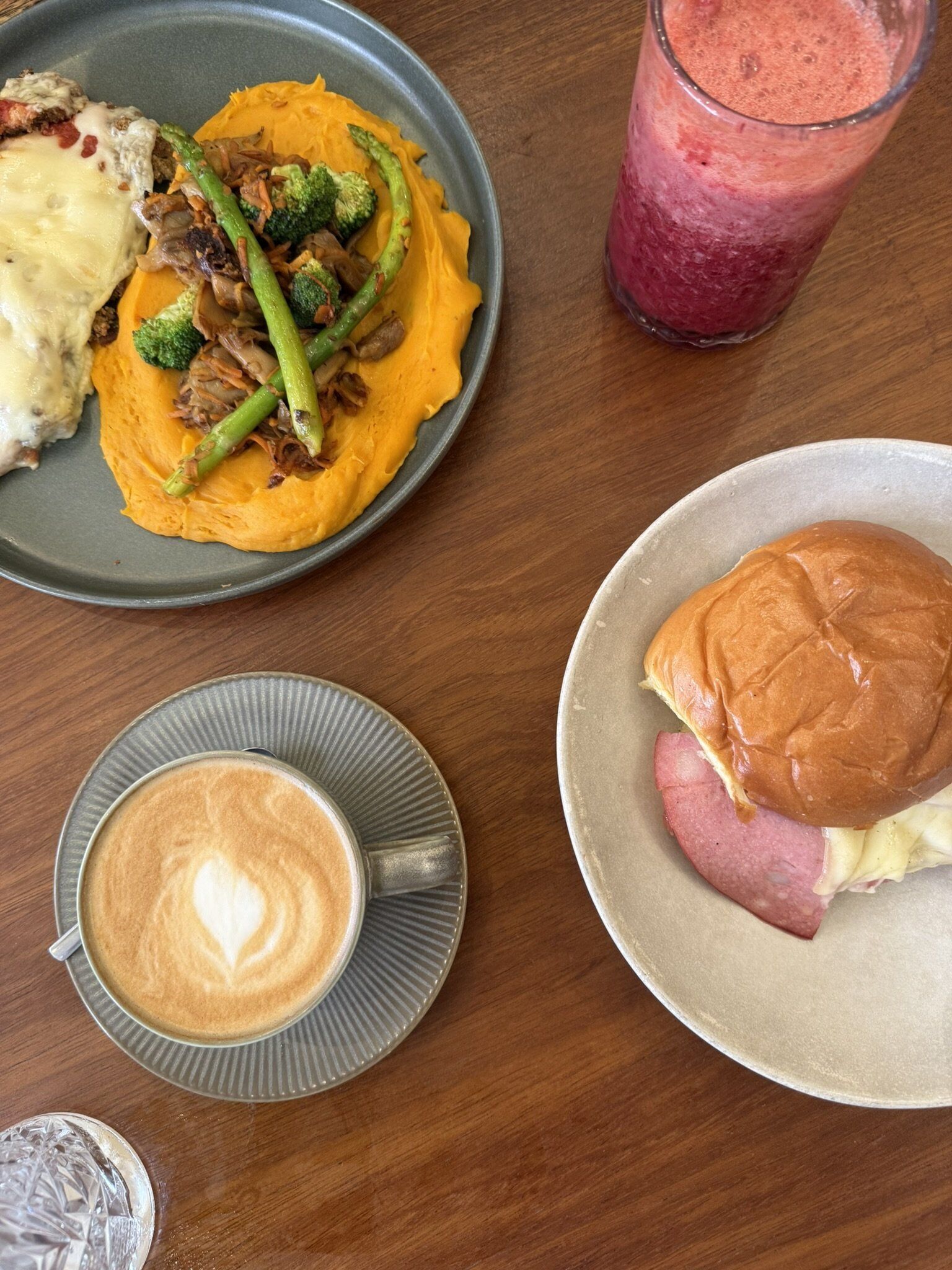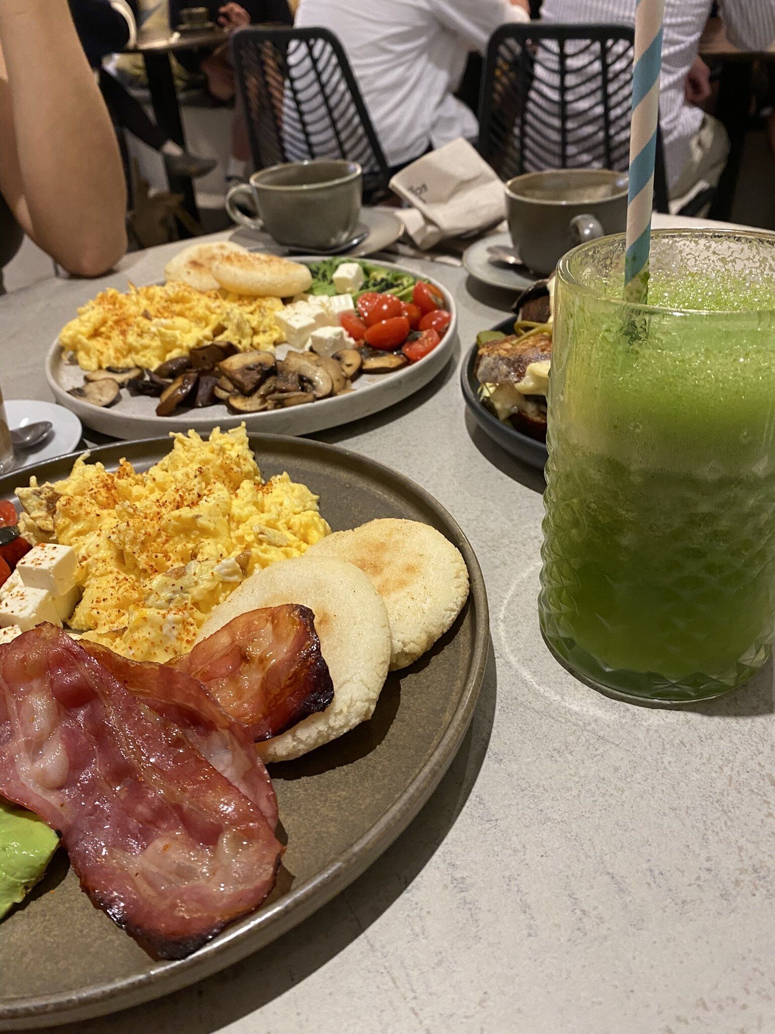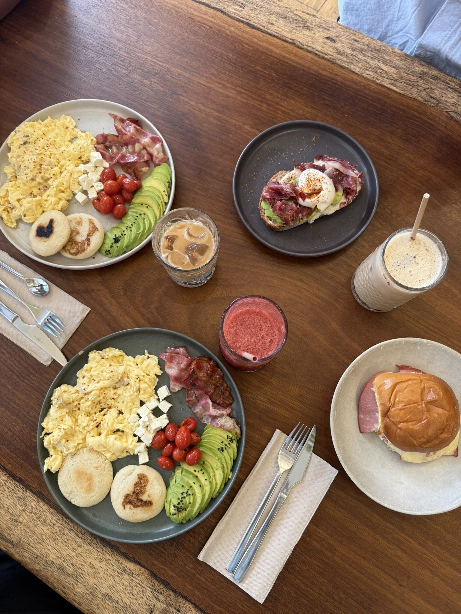 funkys: (un clásico)_ huevos, bacon, aguacate, tomates, queso feta y arepitas