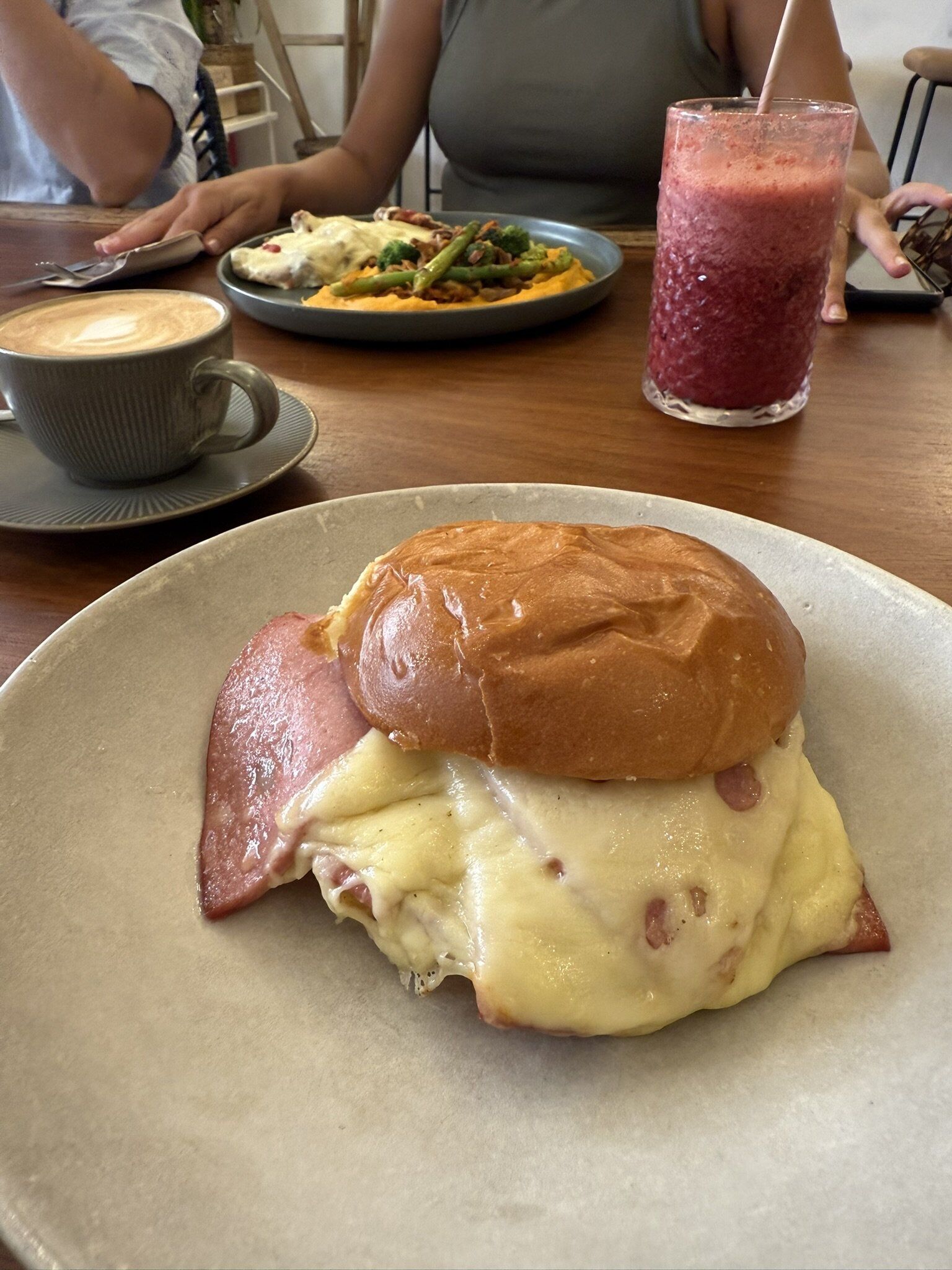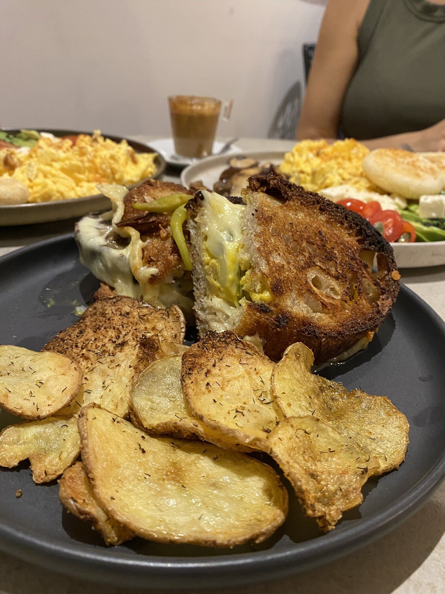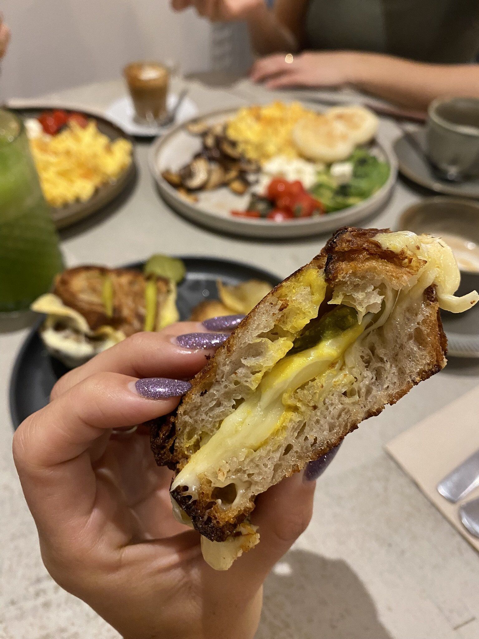 probando el sandwich de queso y berenjena_ queso emmental, gouda, chedar curado bien fundidos, berenjenas en escabeche, pepinillos y un toque a mostaza en pan de hogaza planchado
