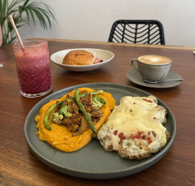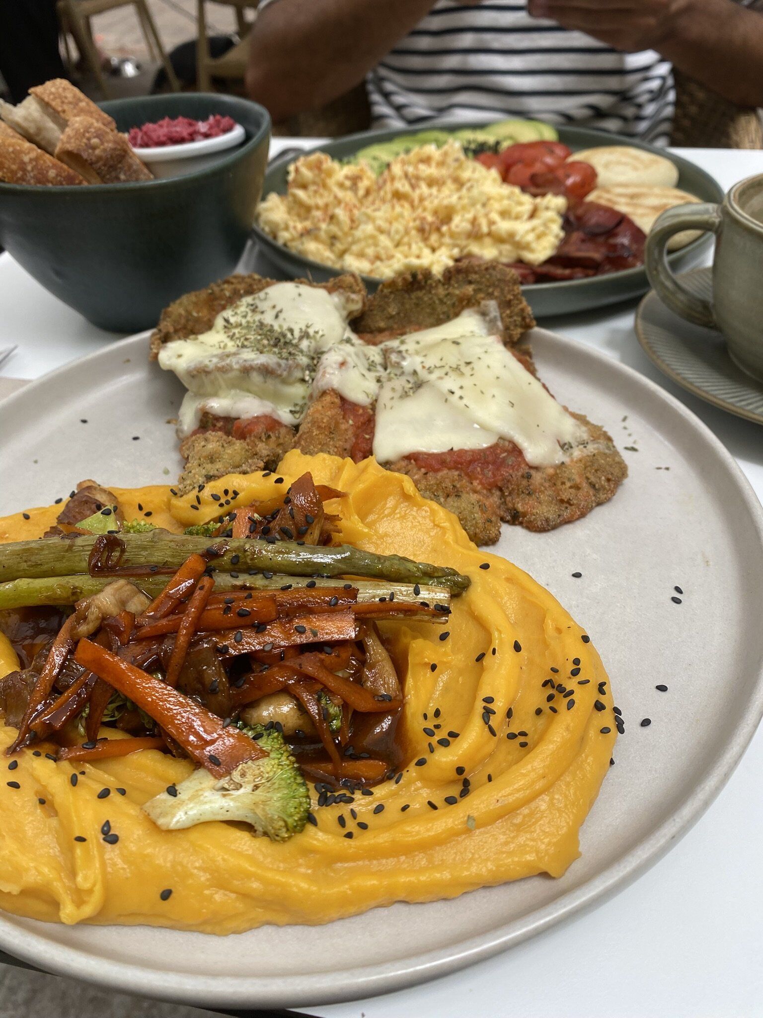 milanesa napolitana: con puré de boniato & saltado de espárragos trigueros, brócoli, zanahoria y girgolas