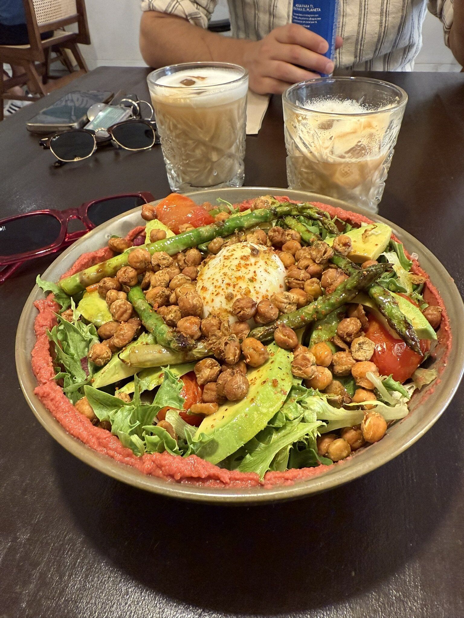 la ensalada de hummus de remolacha y espárragos horneados con garbanzos crunch y huevo mollet