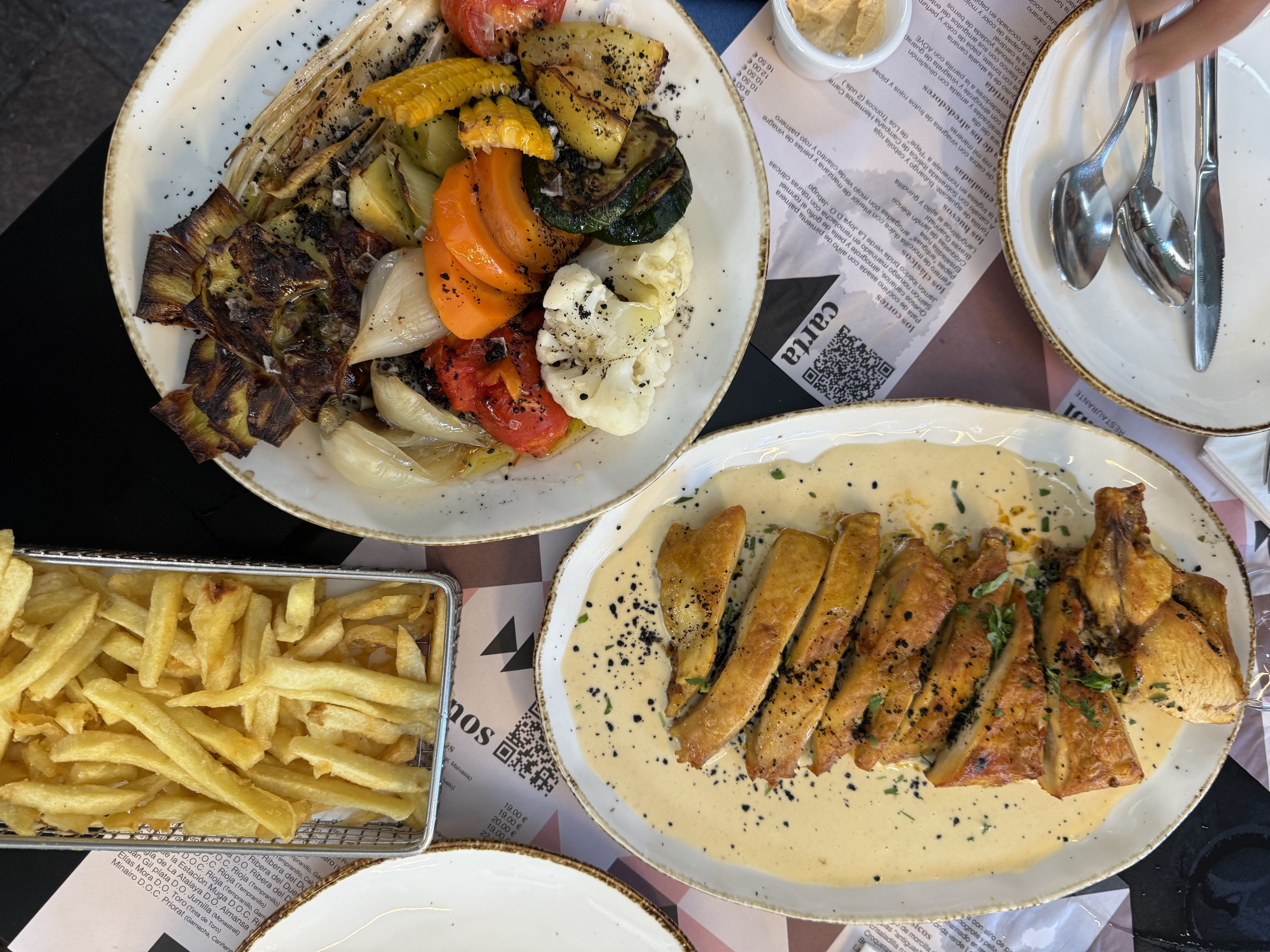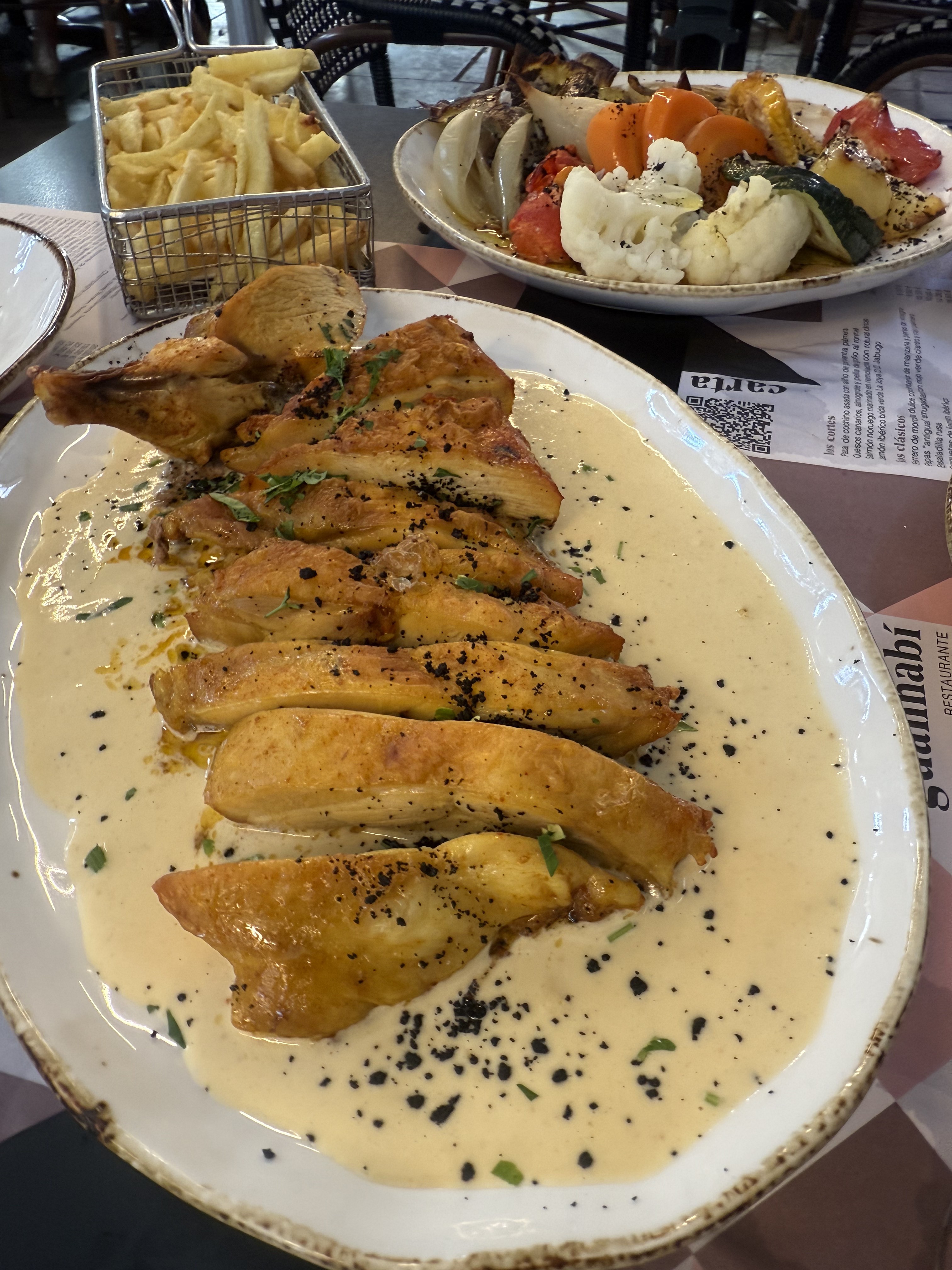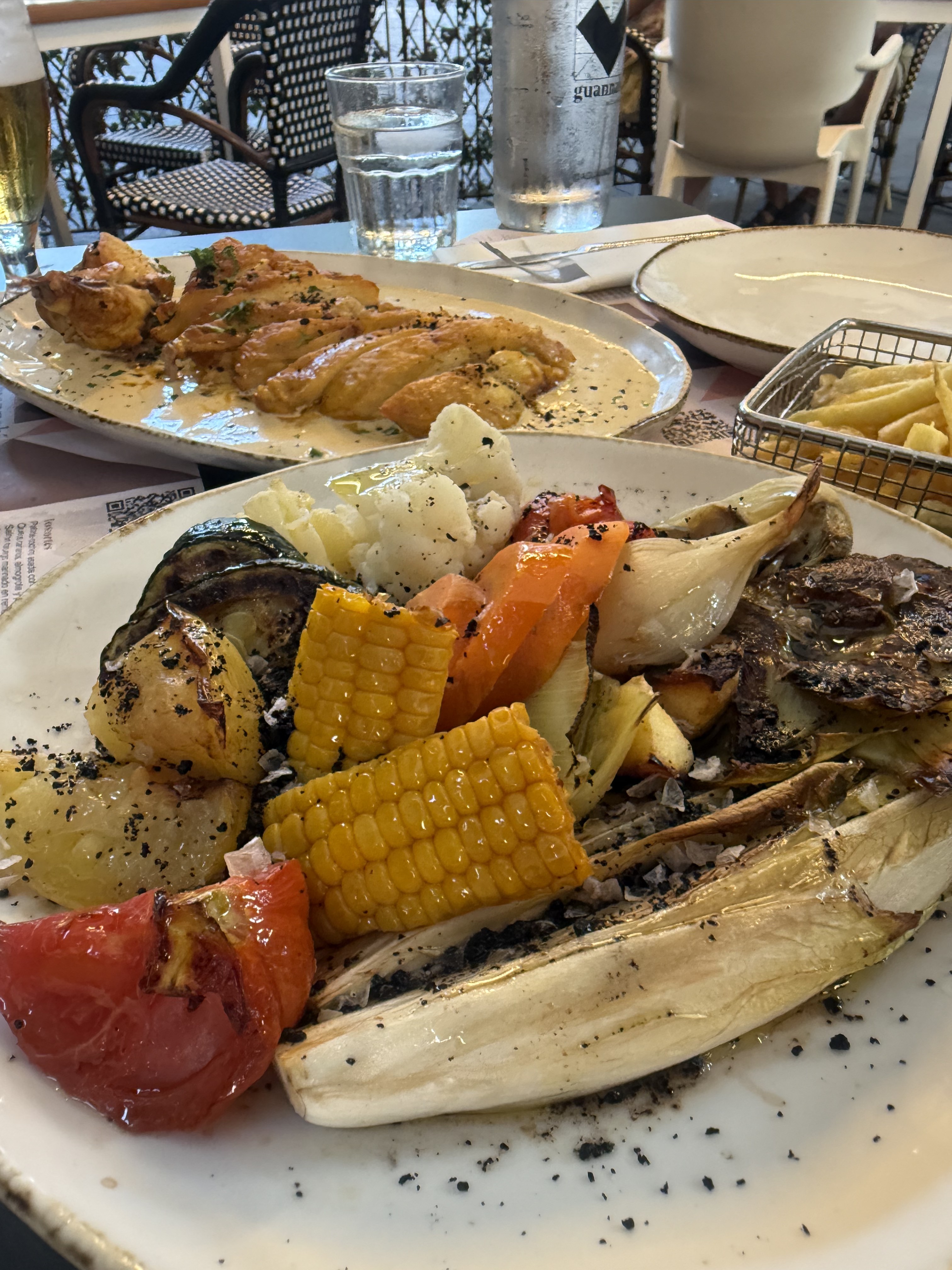 verduras, pollo a la mostaza y papas fritas